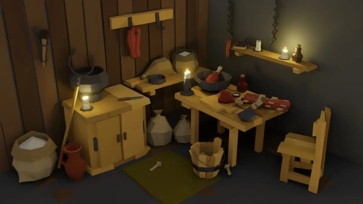 Low-Poly Pack 1.0Package of more than 100 different objects in medieval style (details on pictures):books; containers; food; furniture; lights; tableware; other...3 Textures 64x64 png. (main color, metallic, roughness).All objects have one texture atlas (and used the same matirial as Low-Poly Pack 2.0).Other packages in the same style coming soon (building, instruments, trees, terrain parts...)