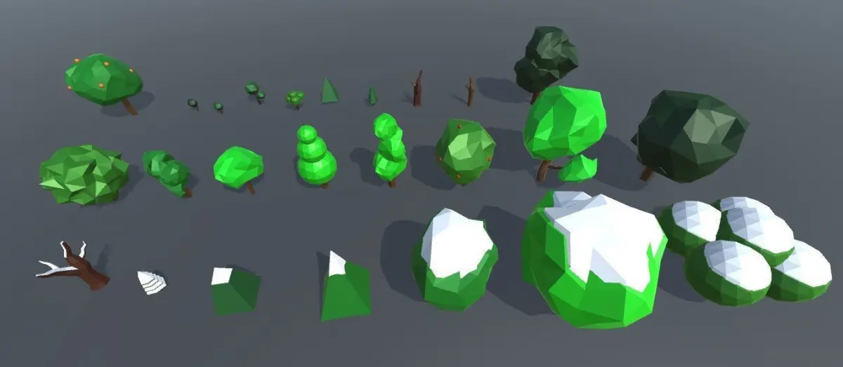 PACKAGE CONTAINS :5 Animals12 Bushes30 Trees26 Rocks and Crystals20 Plants8 Clouds8 Mountains11 Terrains82 Other models like barrels, bridges, weapons, fences, pipes and much more..