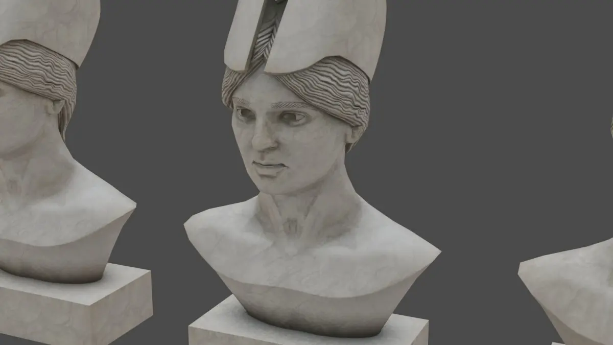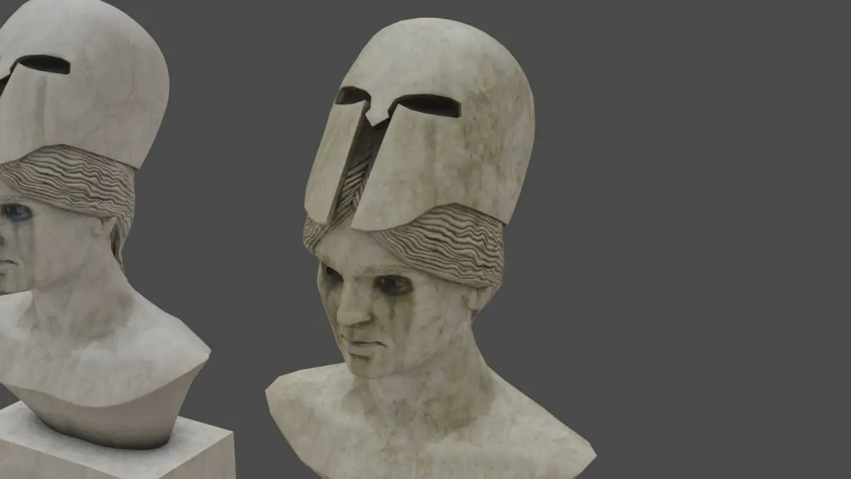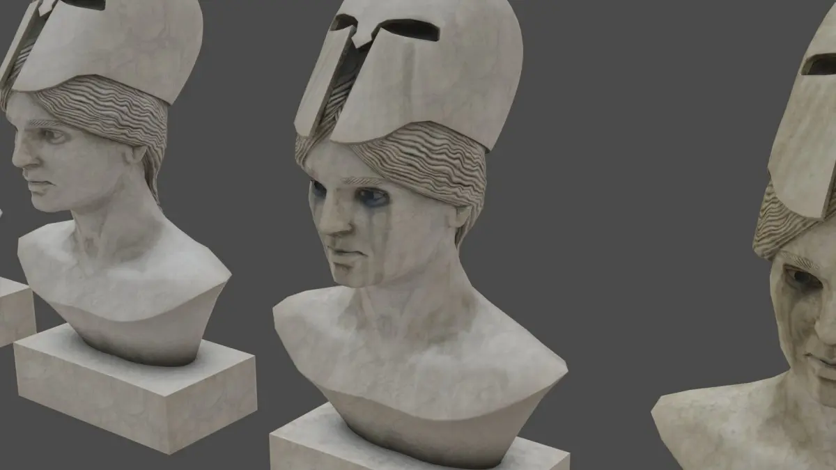 Low poly pallid bust of pallas, chamber door not included, but raven can be purchased separately. Comes with a PBR shader with Diffuse, Roughness, Normal and SSS maps in 4k and 4 different skins with different degrees of weathering, ideal as a prop for scenes.