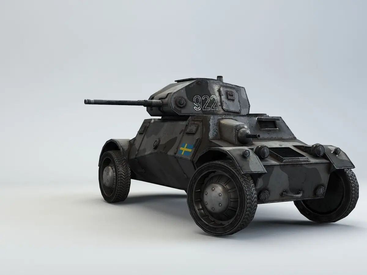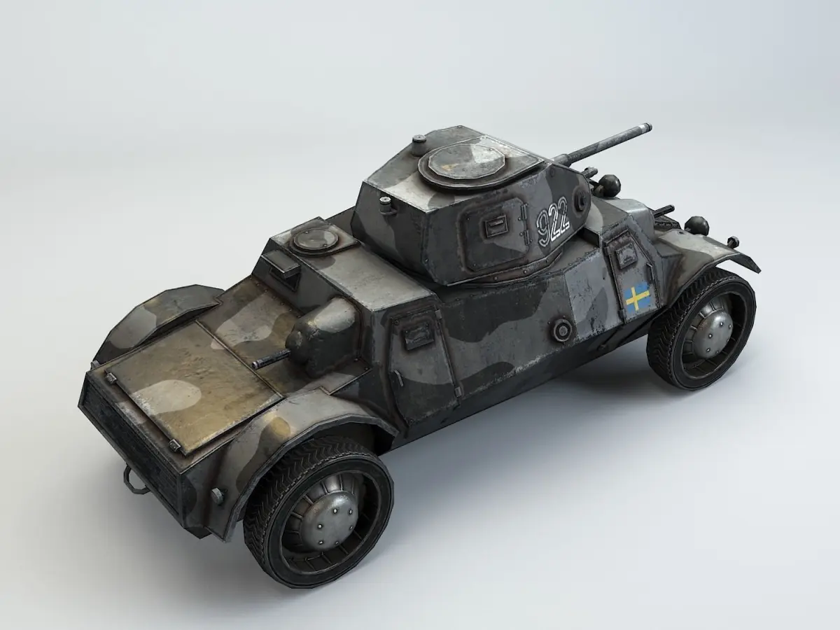 The Pansarbil m/39 was characterized by a low body, although the ground clearance was sufficient for the Swedish roads and terrain. The welded rolled homogeneous armor was relatively thin, with a maximum thickness of 18 mm (0.7 in) on the front, but well distributed and sloped. The crew of six members included the front driver and machine-gunner, the rear driver and rear machine-gunner. The vehicle was symmetrical and could drive either way with the same performances. The 140 hp Scania-Vabis petrol engine was in the middle section, on the hull’s left side, and assisted by a 4 speed gearbox, forward and backward. The standard turret was derived from that of the L-60 (m/38), and had been modified for the installation of radio equipment for the Danish army. It was located in the middle of the hull, operated by the commander and gunner. Danish m/39s were armed with a QF 20 mm (0.79 in) Madsen auto cannon. In addition, two Madsen 8 mm (0.31 in) light machine guns were placed at the front and rear of the vehicle. The third Madsen LMG was coaxial to the main gun.