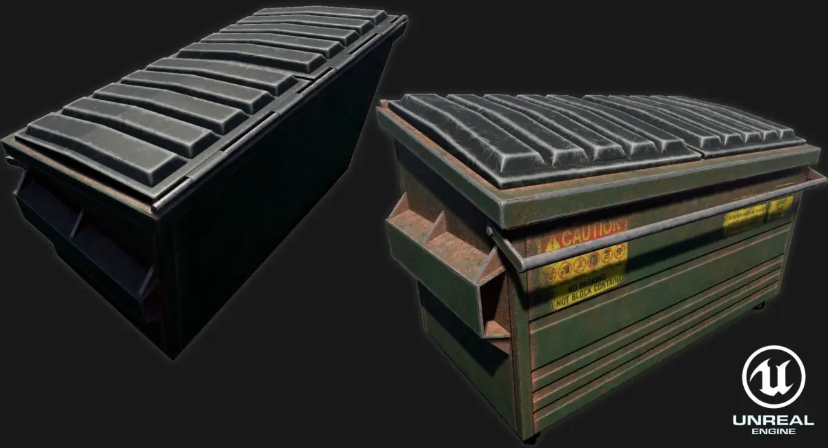 Overview:This is a Low-poly, game ready dumpster model that comes in four different colours (Blue, Green, Red, and Dark Grey)Modelled in 3DS Max 2016. The normal map was baked from a high poly model for added detail.Files named using the Unreal Engine 4 Naming Convention.File uploaded as a packed .7z file.