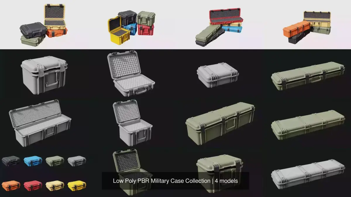 This is a Collection of Low-poly, game ready Military Case in 8 colours (Black, Blue, Green, Grey, Orange, Red, Tan, Yellow)