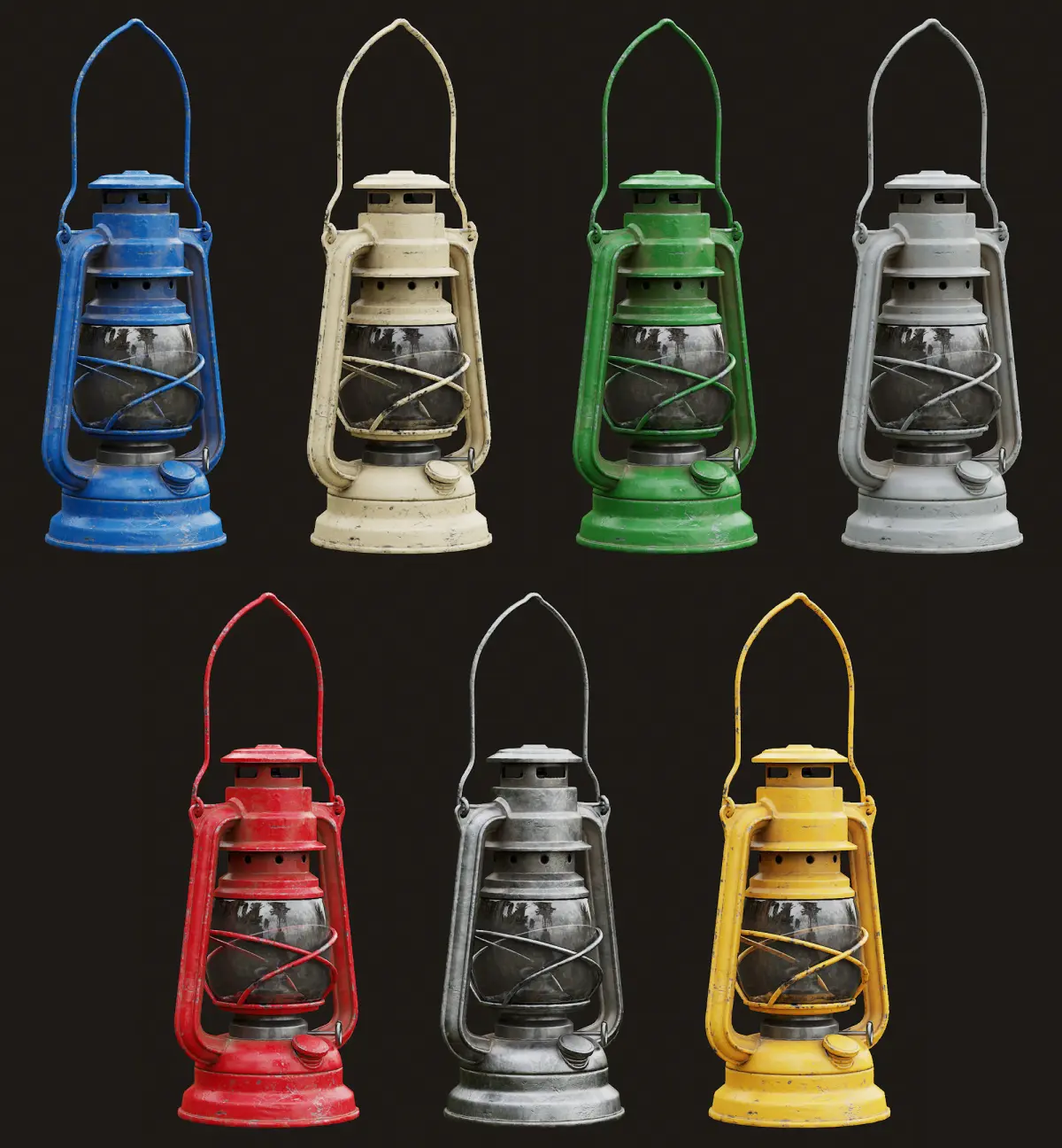 This is a Low-poly, game ready Oil Lantern with 7 colours (Blue, Cream, Green, Grey, Red, Yellow, Bare Metal) as well as Rusted versions