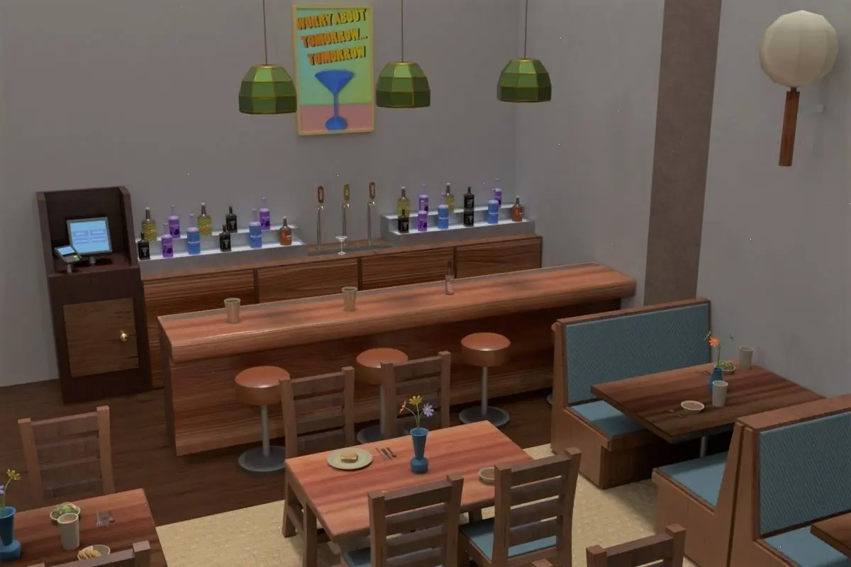 Barshelf Barstool Cushion Bartop Beer Bottle Booth Bourbon Bottle Bowl (w/ alternate textures) Breadbowl Burger Burger Poster Card Reader Ceramic Cup (w/ alternate textures) Chair Computer Cookie Cutlery Deep Fryer Flowers Grape Tomato Hanging Lamp Kitchen Table Light Fixture Martini Glass Modular Building Pieces (Wall, Corner Pillar, Pillar, Entry, Door, Inner Door, Roof, Roof Small, Roof Corner, Floor, Floor Small, Inner Wall, Inner Wall Small, Inner Walkway) Open Neon Sign Order Kiosk Passout Plate (w/ alternate textures) Pole Base Prep Table Salad Sign Sink Soup Steak Stove Table Top (w/ alternate textures) Vase Vase Alt Vodka Bottle (w/ alternate textures) Vodka Poster Whiskey Bottle (w/ alternate textures)