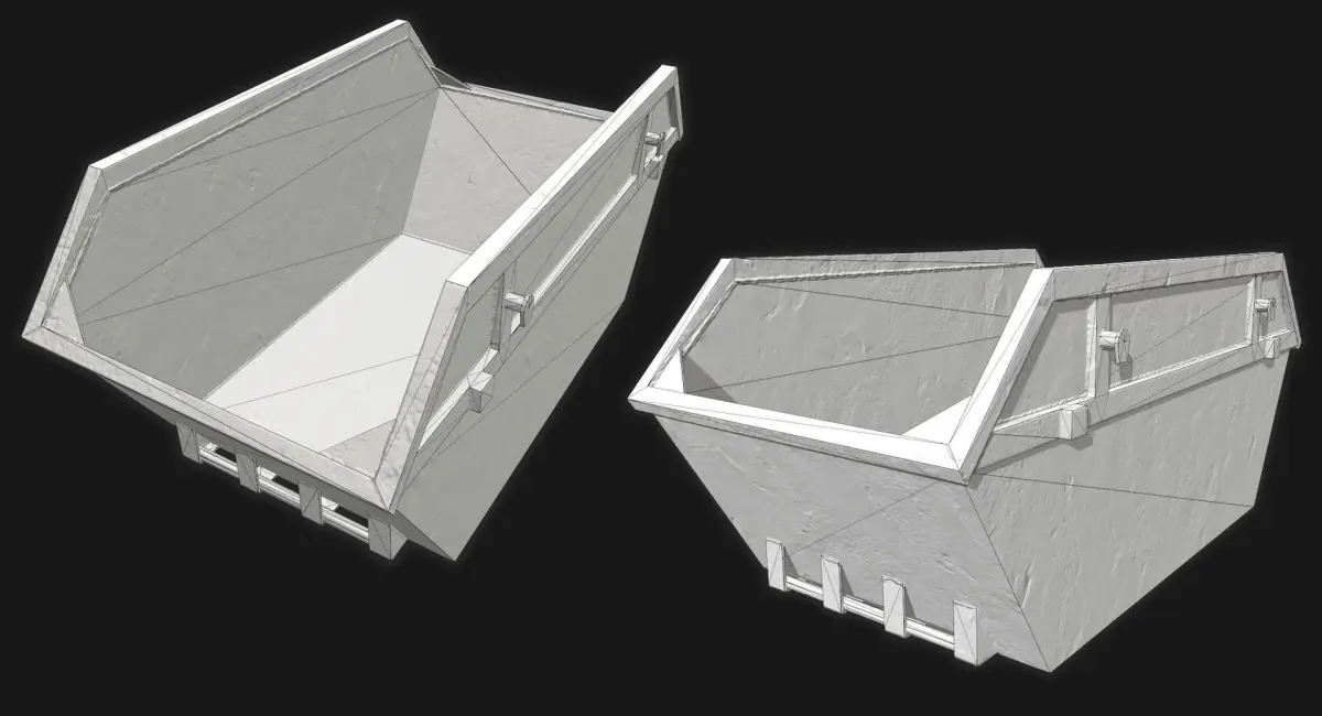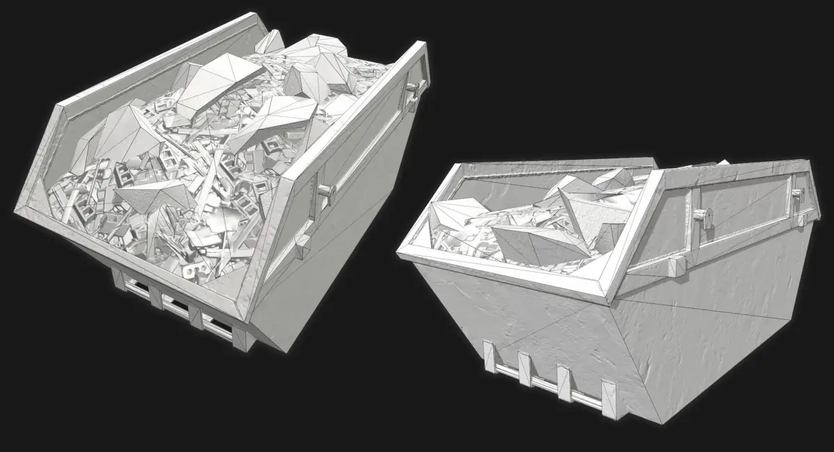 Textures:PBR Textures are 2048x2048 for the skip and 1024x1024 for the rubble in PNG format with both Metalness and Specular workflow. Also contains two packed Metalness, Roughness, Ambient Occlusion maps.