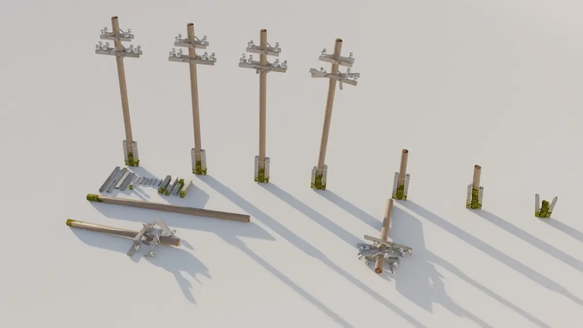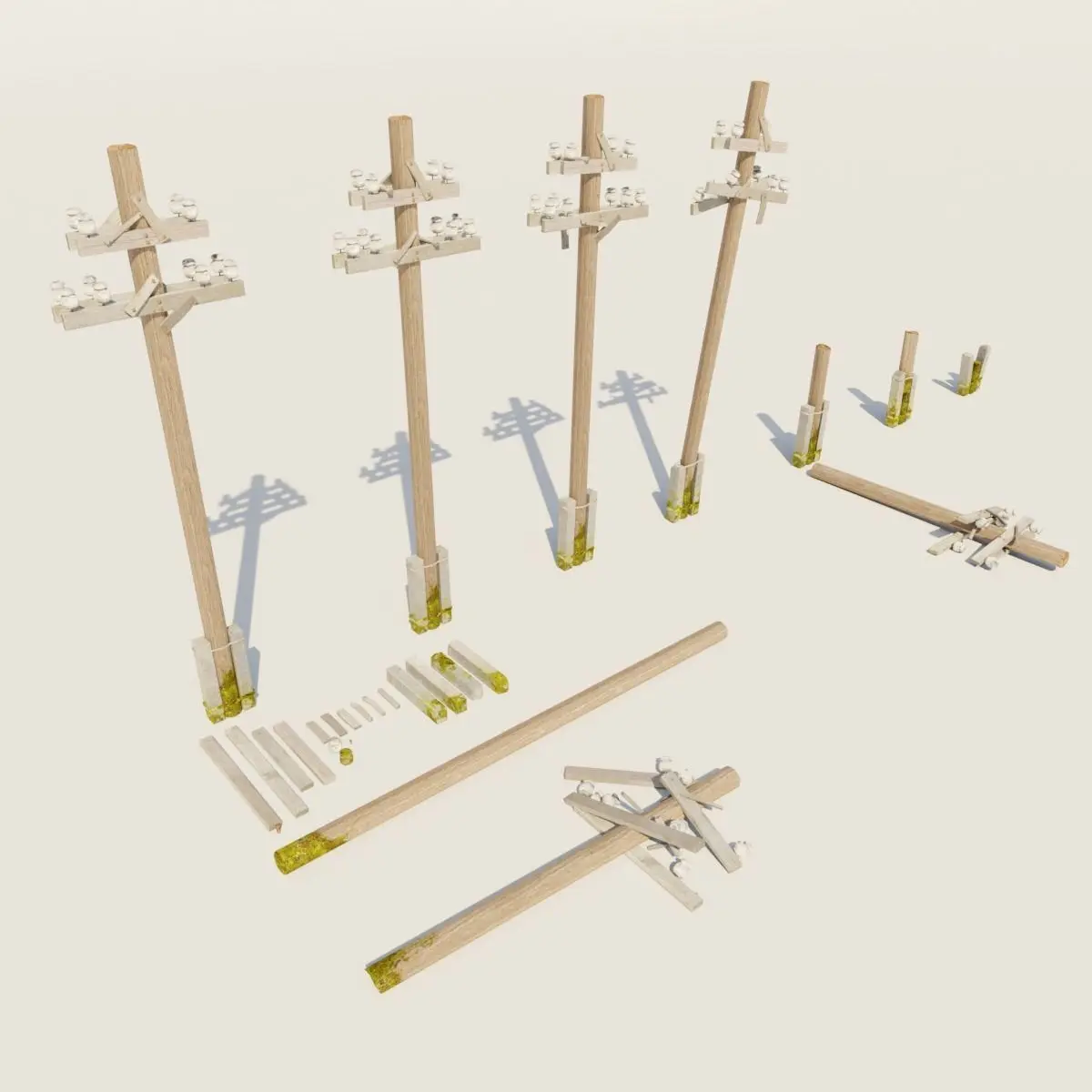 Wood electric wires poles asset with different variations of destruction (from new build to totaly destructed). Poles around 6 meters height. Also included are the sub meshes that were used for this pole like planks, nails, stone. Optimized For Real time rendering and games, tested in Unreal Engine 4.