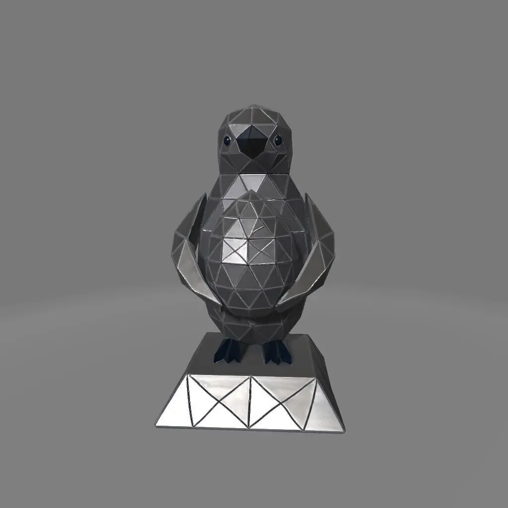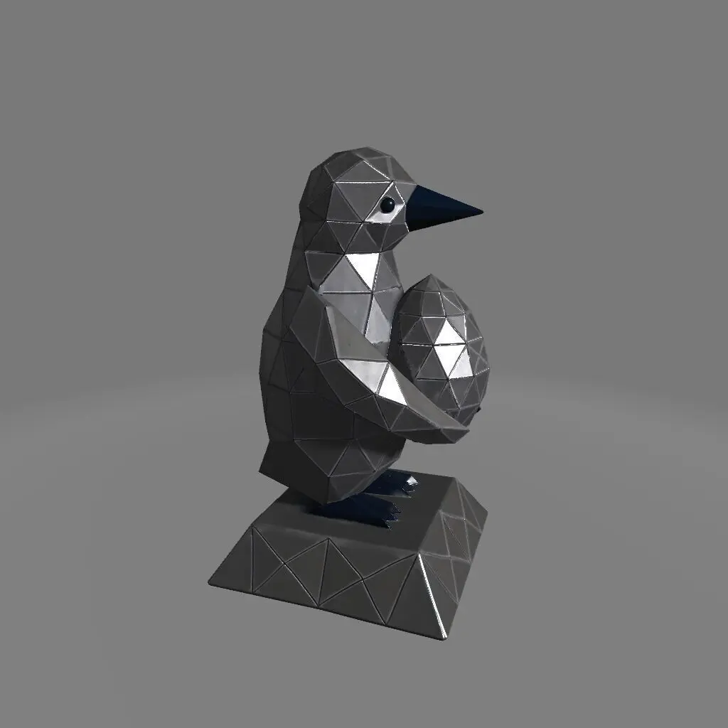 A 3D printed penguin in low-poly style, standing upright on a geometric base and cradling a faceted egg between its legs. The angular design and integrated stand offer stability and a sleek, modern aesthetic, making it a playful and unique decor piece.