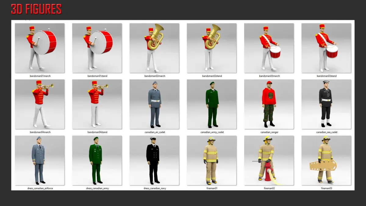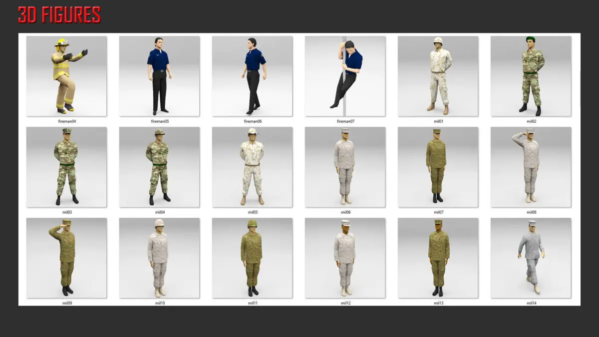 A wide selection of figures in uniform, both from the military and emergency services in a variety of countries. Paramedics and hospital staff are not included, as they are in the Medical collection. Offered initially in native SketchUp format, other formats will be added in time or upon request (where possible). As with other collection the average figure is only 2000-3000 polys, combining lightness with an acceptable level of detail for mid to distant placement in renderings.