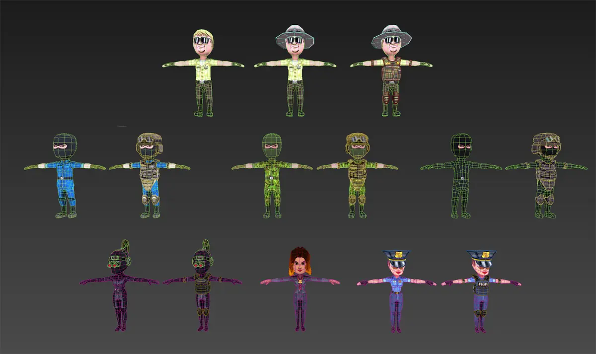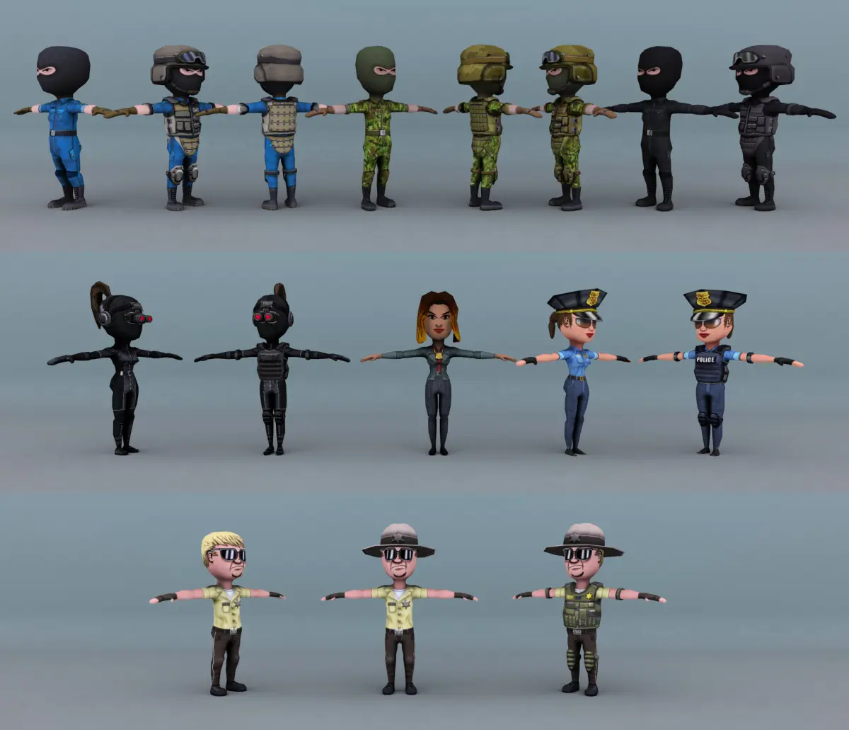 Simple low poly models suitable for mobile games. Not rigged. Model work good with Mixamo, checked in Unity. Two base models, female and male with additional equipment included for every character. All main male textures fit on the male model, all female textures fit on the female model. Original 2048x2048 main textures included.