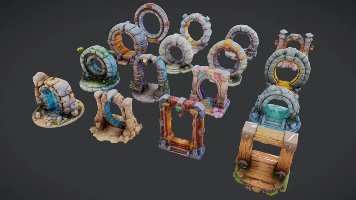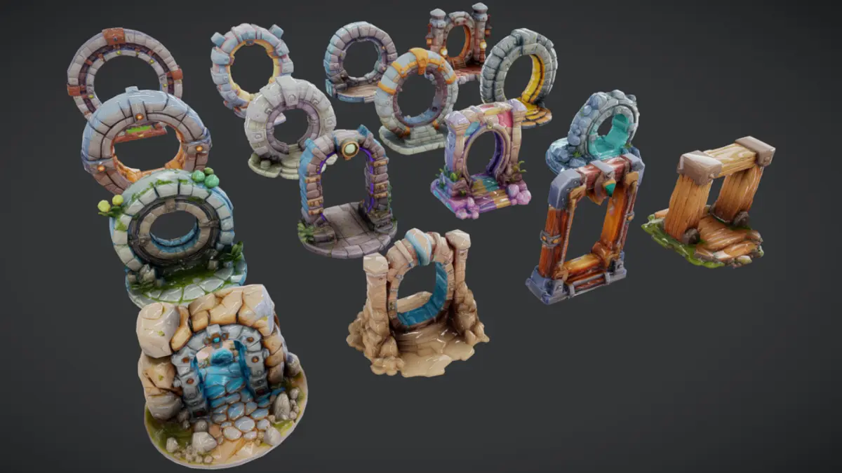 16 sets of low poly portal with corresponding texture.PBR design style - texture contain base color, metallic, normal and roughnessThis pack is great for any RPG design in game development