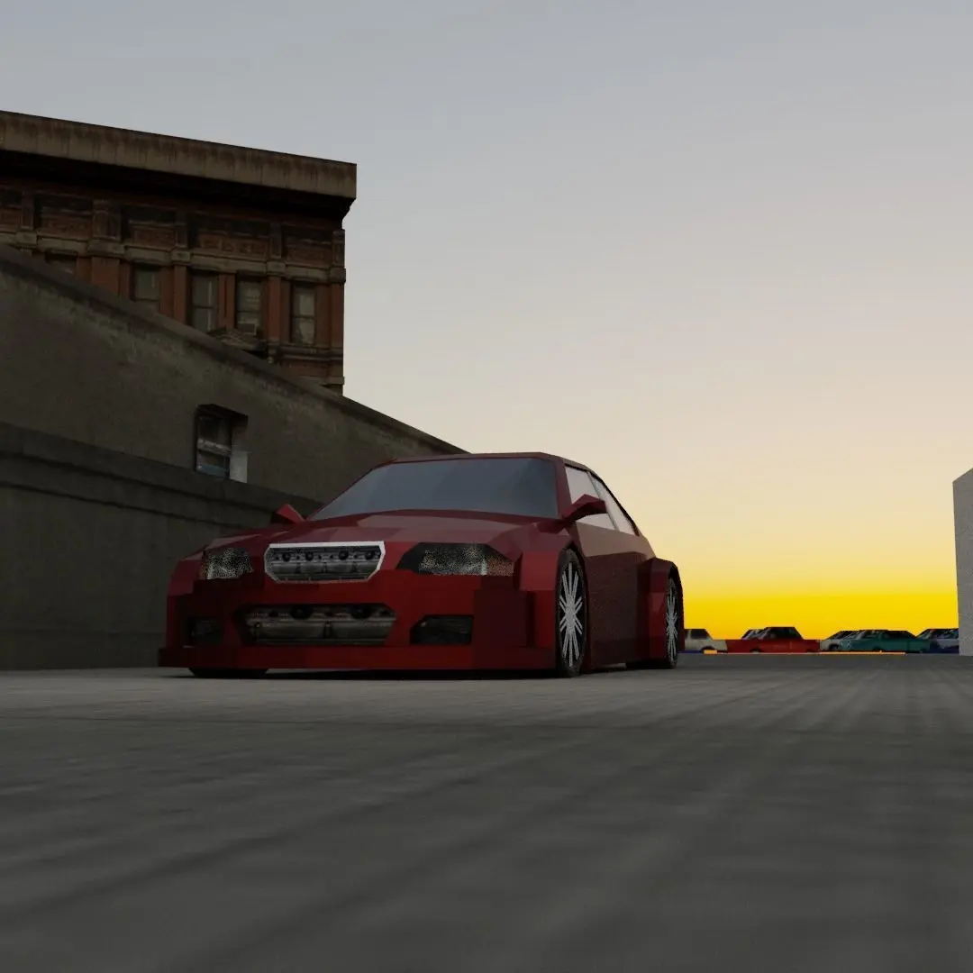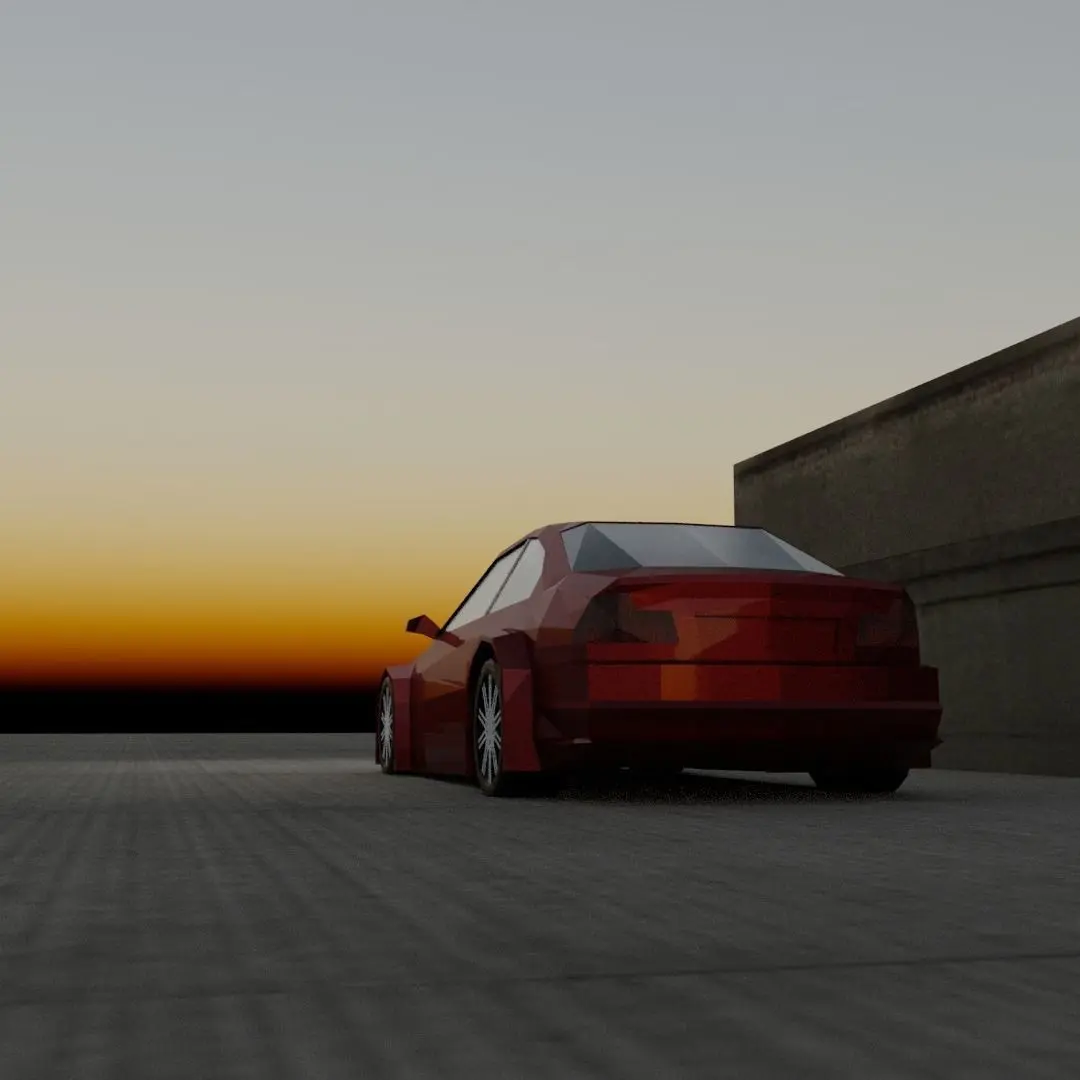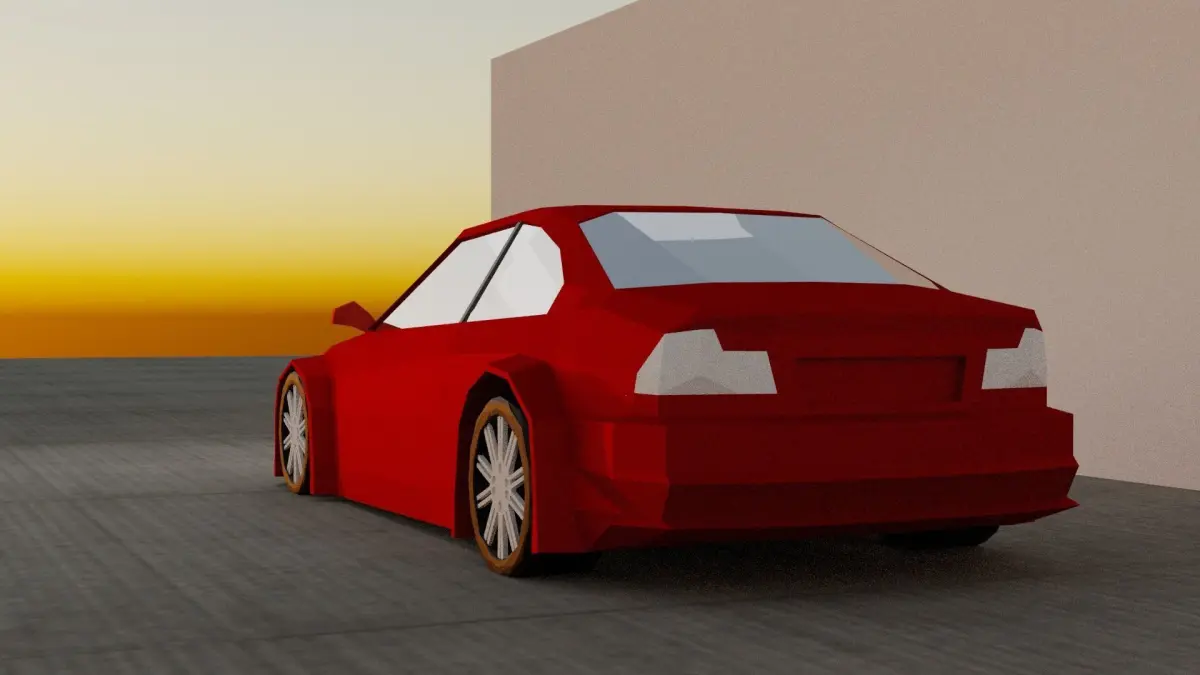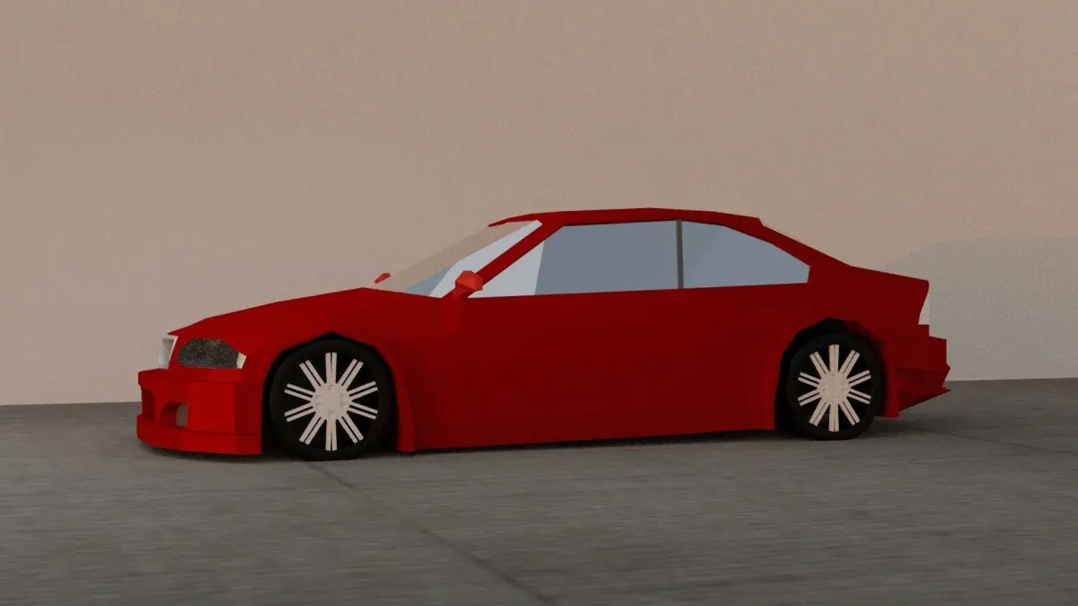 low poly race car for racing games, wheels are separated, car has very low poly interior, doors open, hood and trunk open, front and rear bumper separated