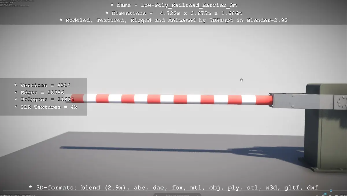 The pbr-textured low-poly version of the railroad barrier with a range of 3 meters.Also included are two non-animated versions, open and closed.