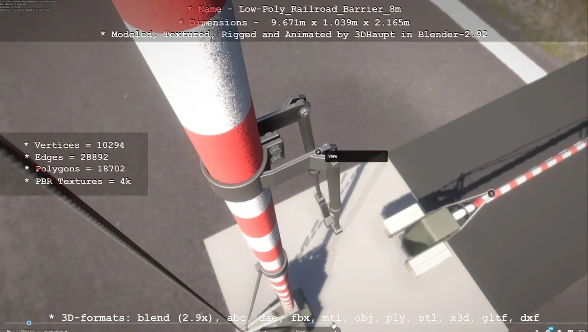 The pbr-textured low-poly version of the railroad barrier with a range of 8 meters.Also included are two non-animated versions, open and closed.