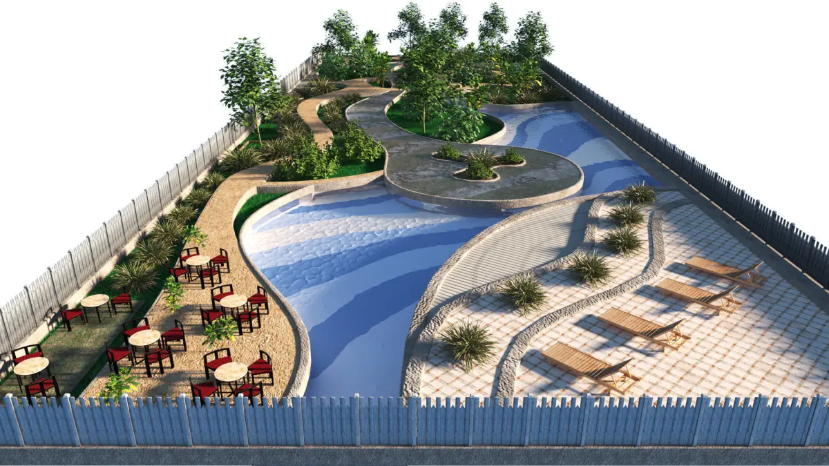 - A curved pool serves as the centerpiece, reflecting the sky and providing a refreshing focal point.