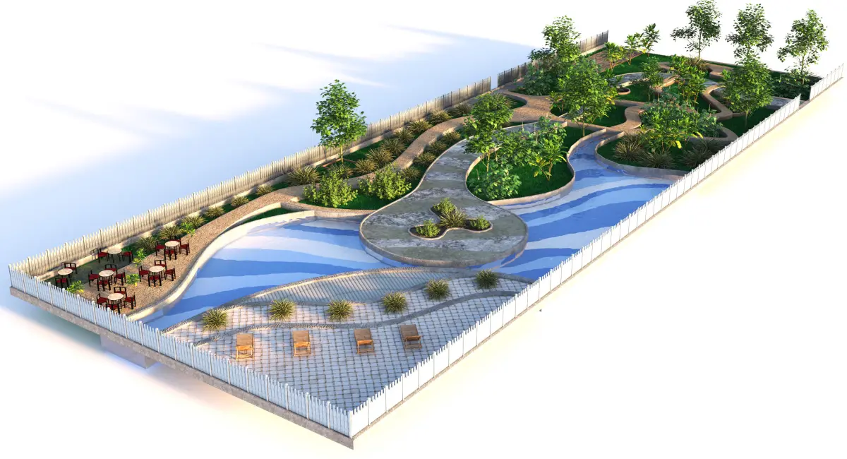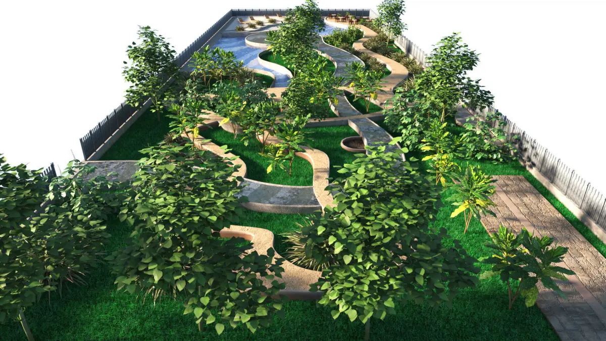 - Curvaceous pathways meander gracefully through the space, inviting exploration and creating a sense of organic flow.