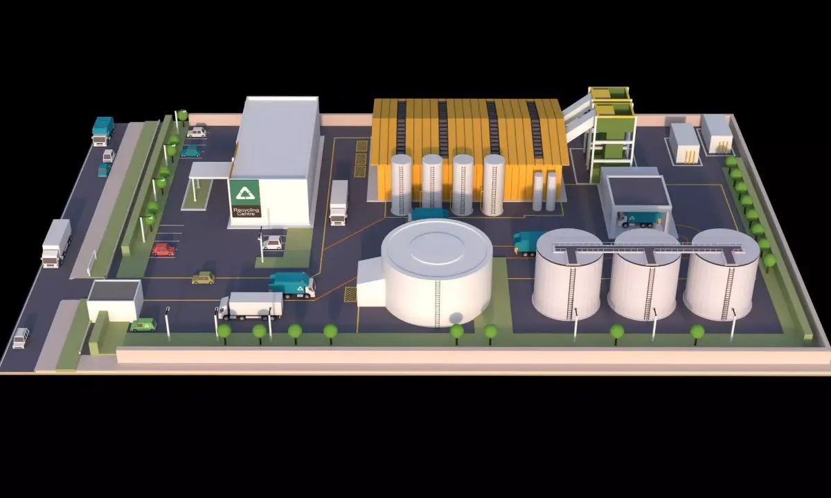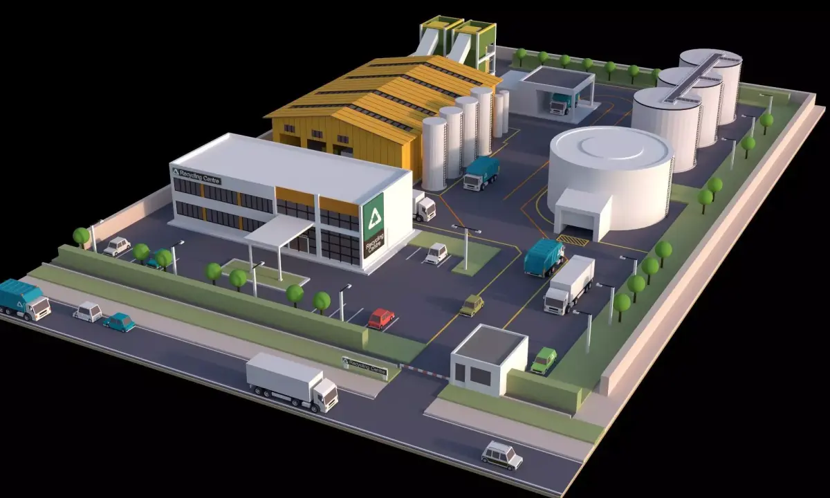 This is a complete low-poly 3D model of a recycling plant/waste treatment facility, featuring a clean, isometric perspective and optimized for real-time rendering, visualization, and presentation.