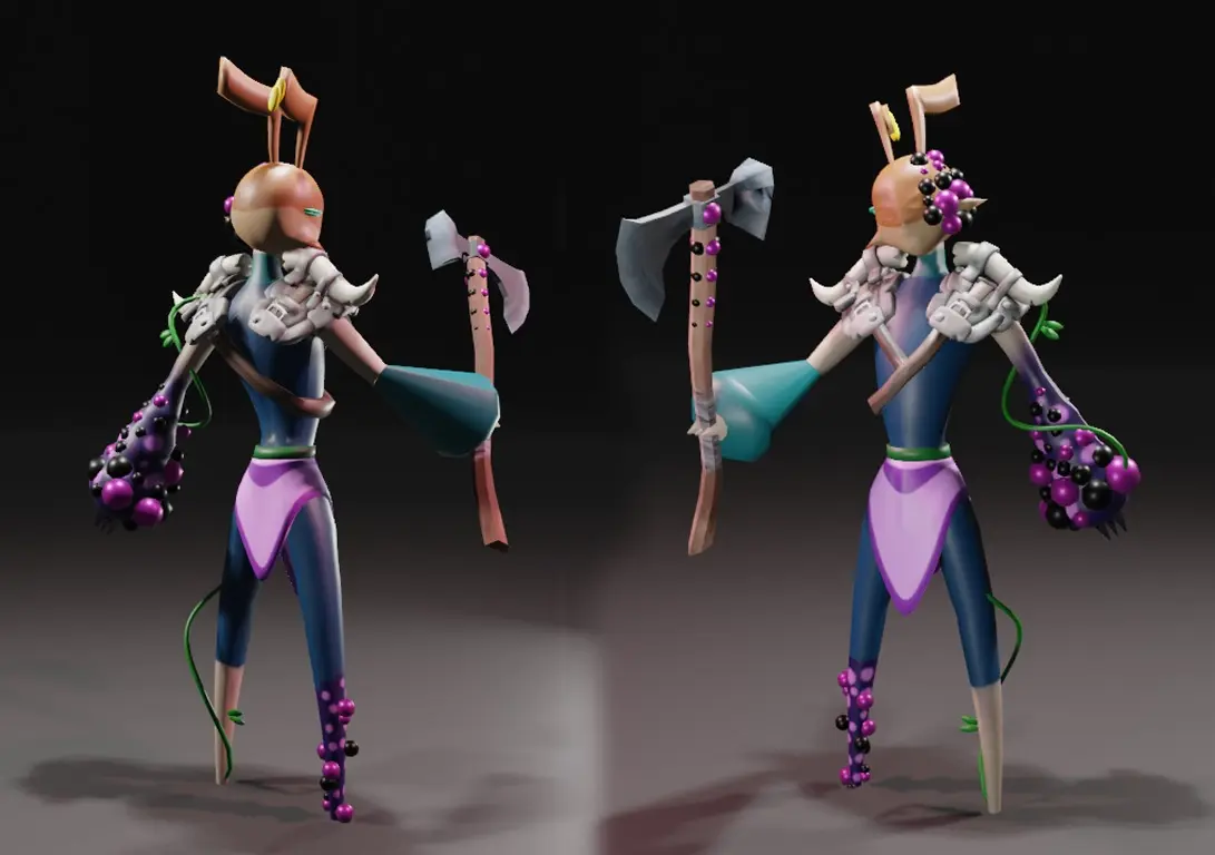 This character is a low-poly, game-ready, and fully rigged ant warrior designed for fantasy settings. Standing tall with a tribal Viking vibe, he wields a large axe. His exoskeleton is a vibrant, colorful purple, perfect for adding an epic flair to your game. Ideal for Unity and Unreal Engine, this ant is ready for battle in your fantasy world.