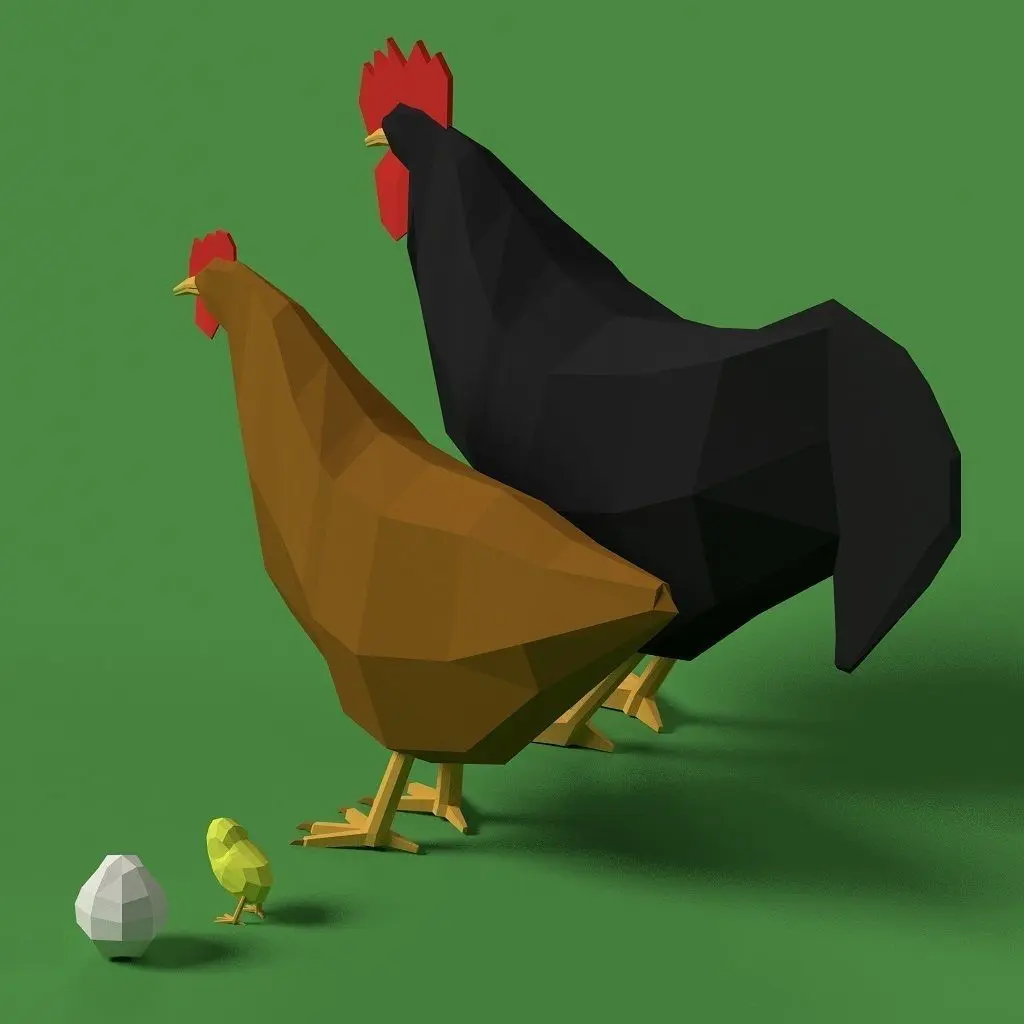 File contains models of rooster, hen, chicken and egg in blend, fbx and obj file. Rooster faces = 384, Hen = 314, Chicken = 160 Egg = 40.