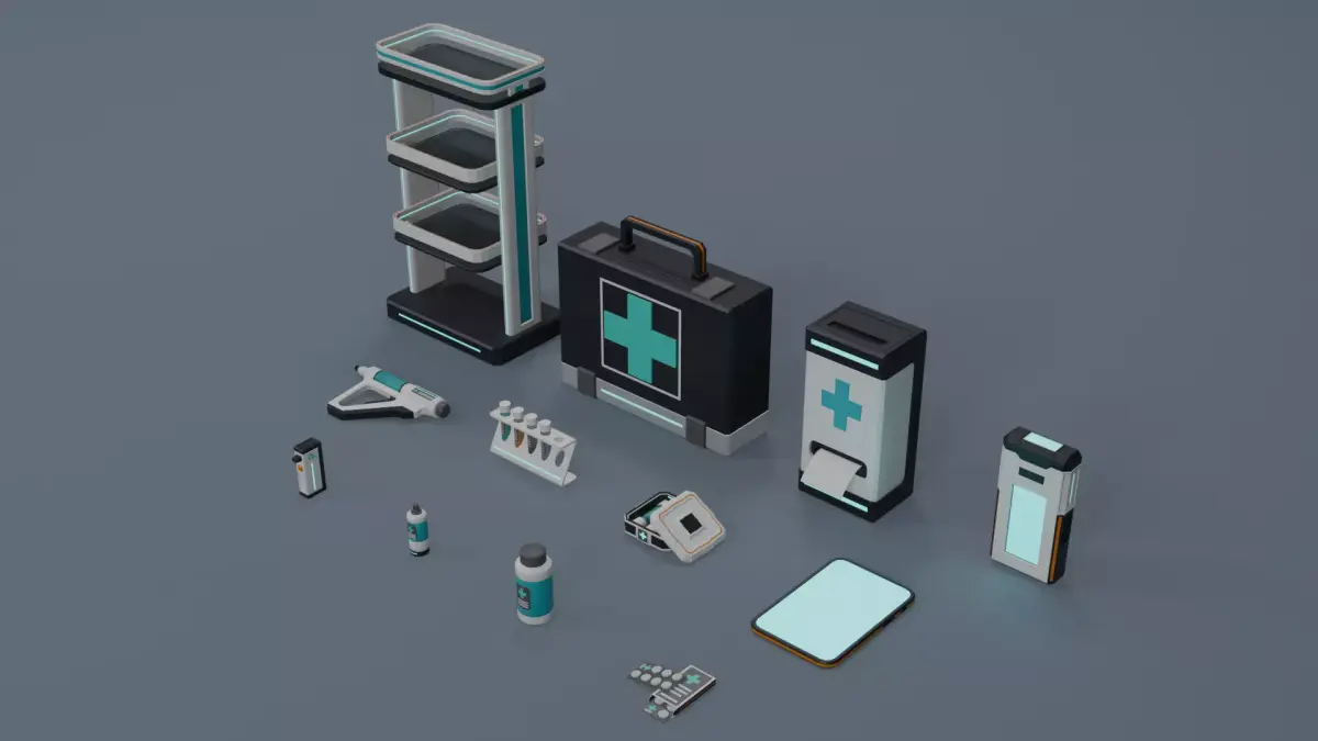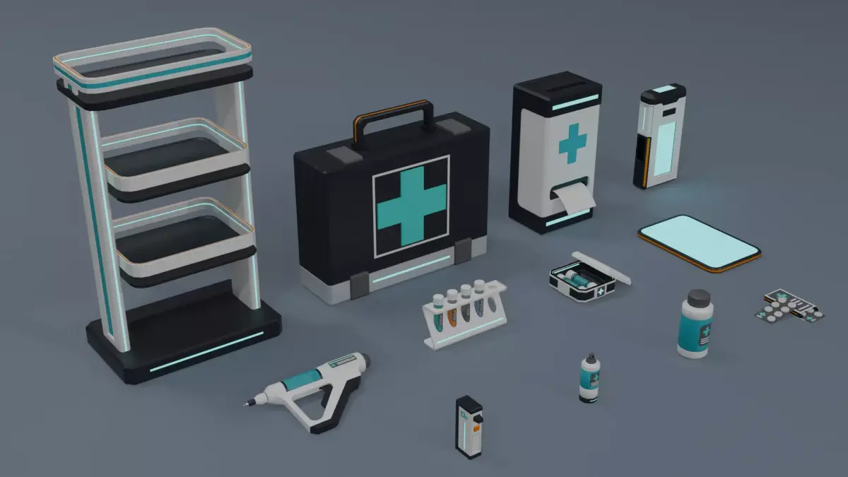These models represent the essential small devices and tools of a sci-fi medical environment, suitable for medkits, research labs, emergency pods, or portable diagnostic stations.