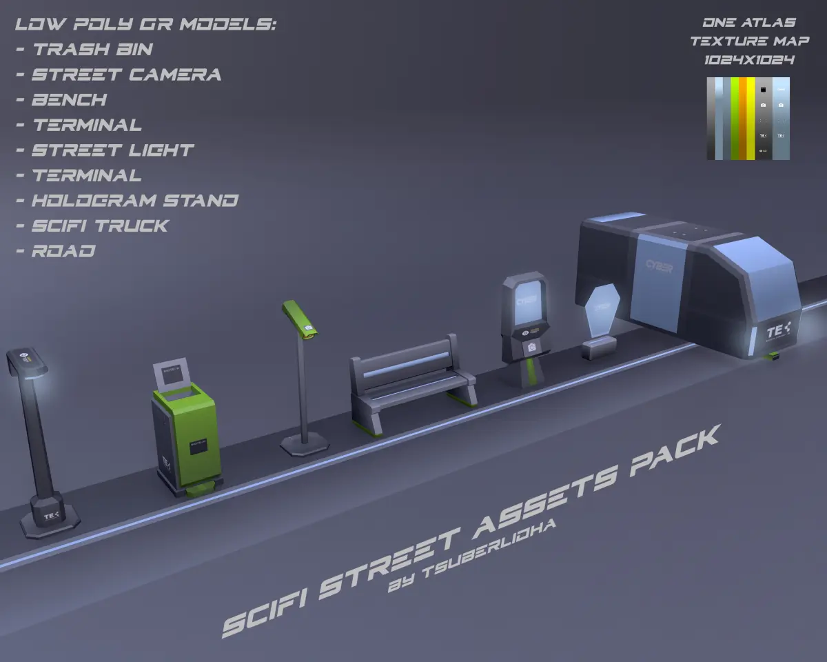 hi everyone,the asset pack includes 8 game-ready props:Trash Bin – Street Camera – Bench – Terminal – Street Light – Hologram Stand – Sci-Fi Truck – Road.fbx fileblender scene file (screenshoot)atlas map 1024x1024