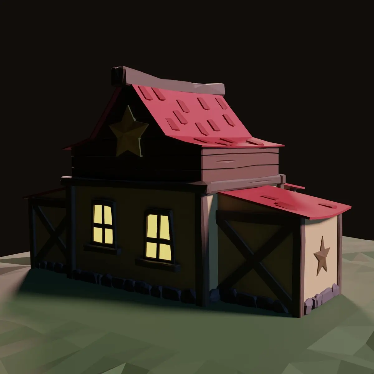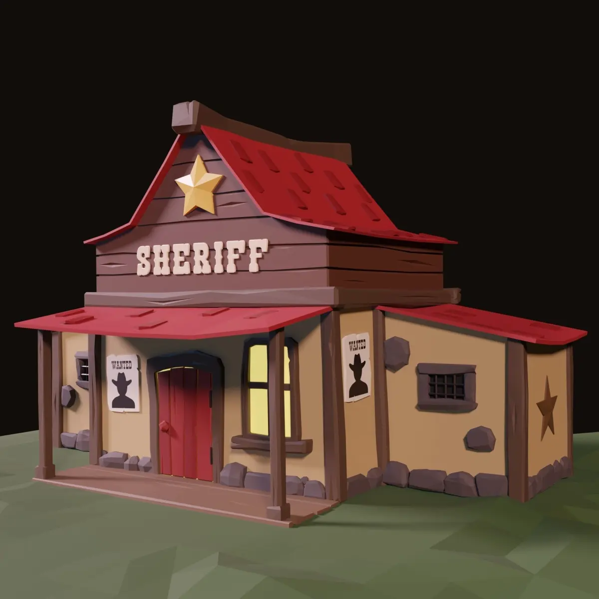 A cartoon stylized low poly sheriff's office. Ready for import to game engines using image textures and also set up with procedural materials for Blender rendering. Contains diffuse and roughness 2k textures (png).