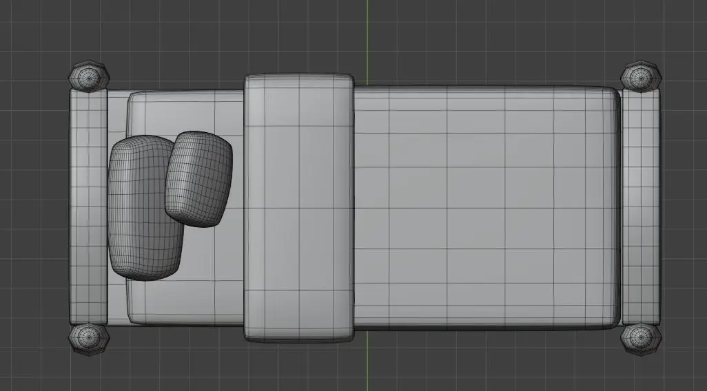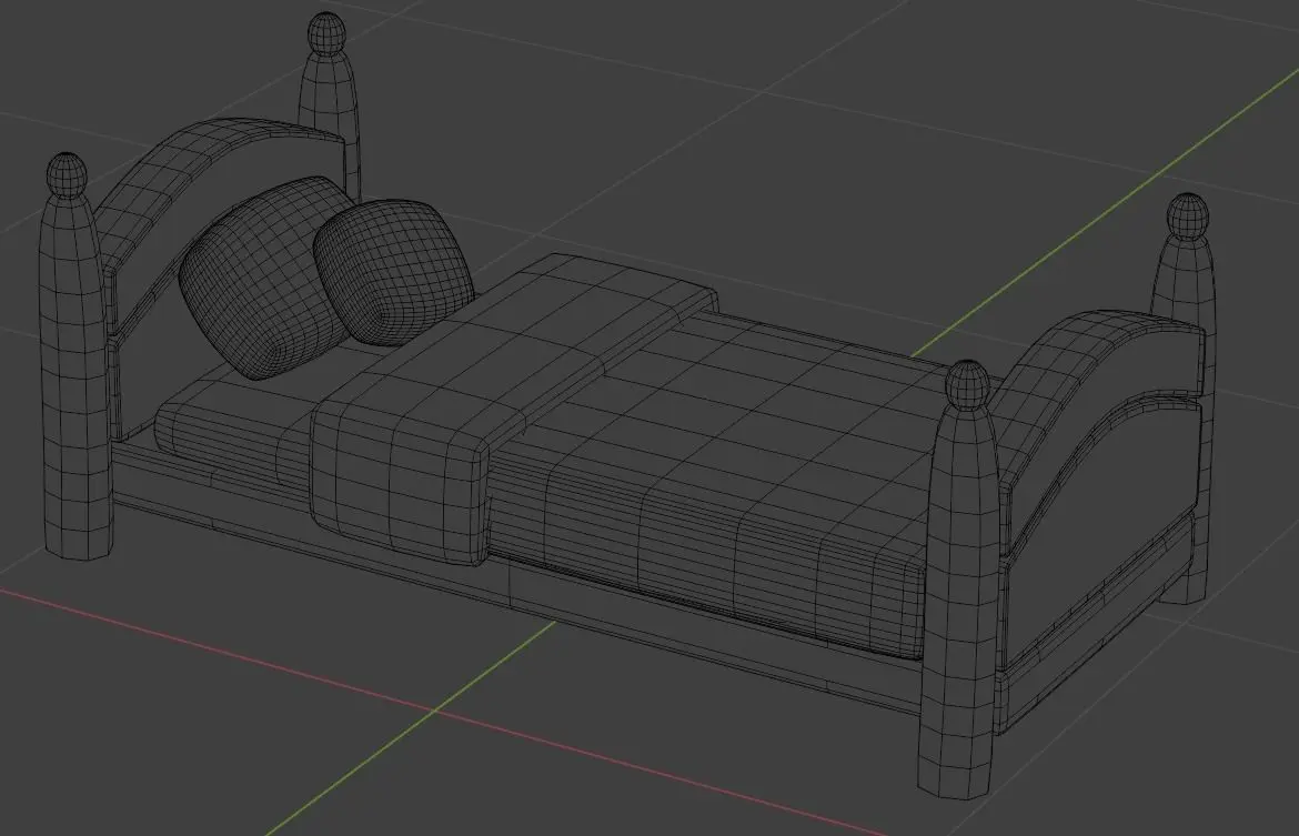 This 3D model of a single bed features a traditional design with a rounded headboard and posts at each corner. The bed is pictured with a light brown wooden frame and is fitted with a pastel colored mattress/sheet and pillows. The style is simple and conveys a warm and inviting atmosphere. The model is low poly.