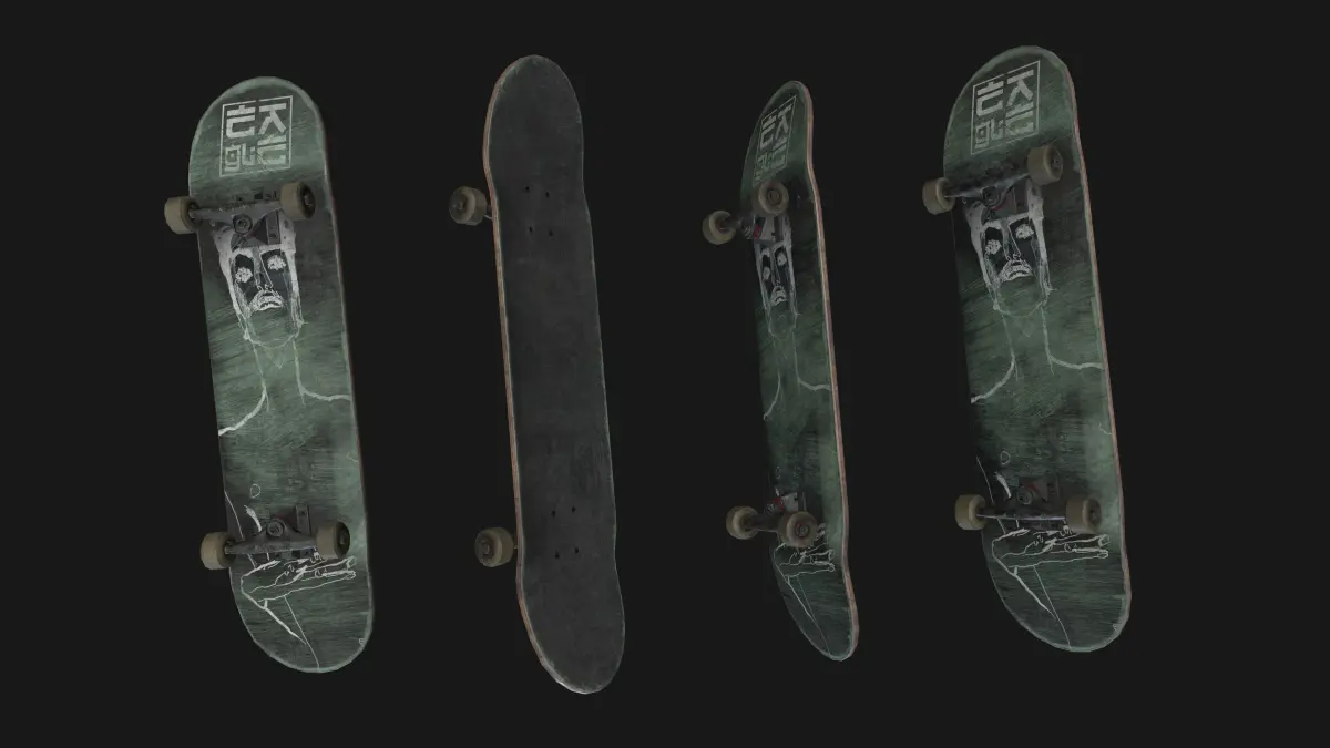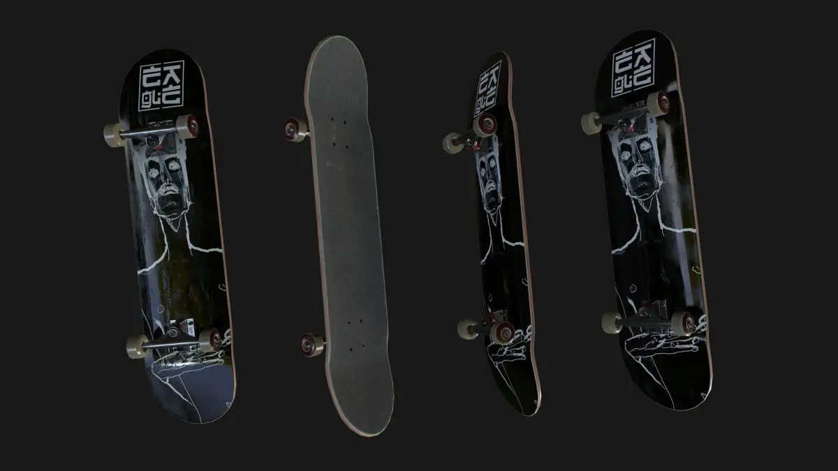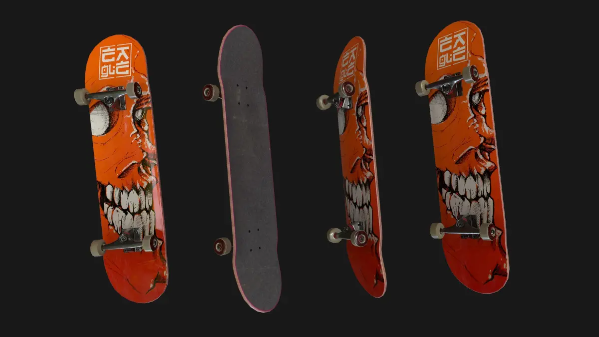 Skateboard Includes 2 mesh with 10 texture variation. Polys: 9,348 Verts: 9,374 (can be deleted not visible details)