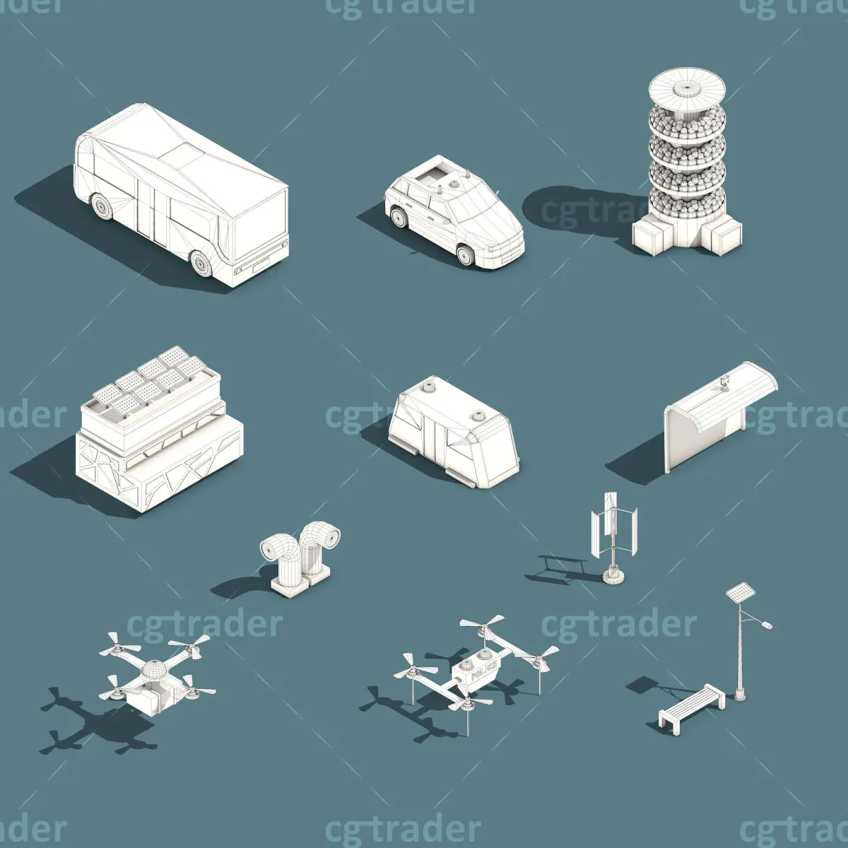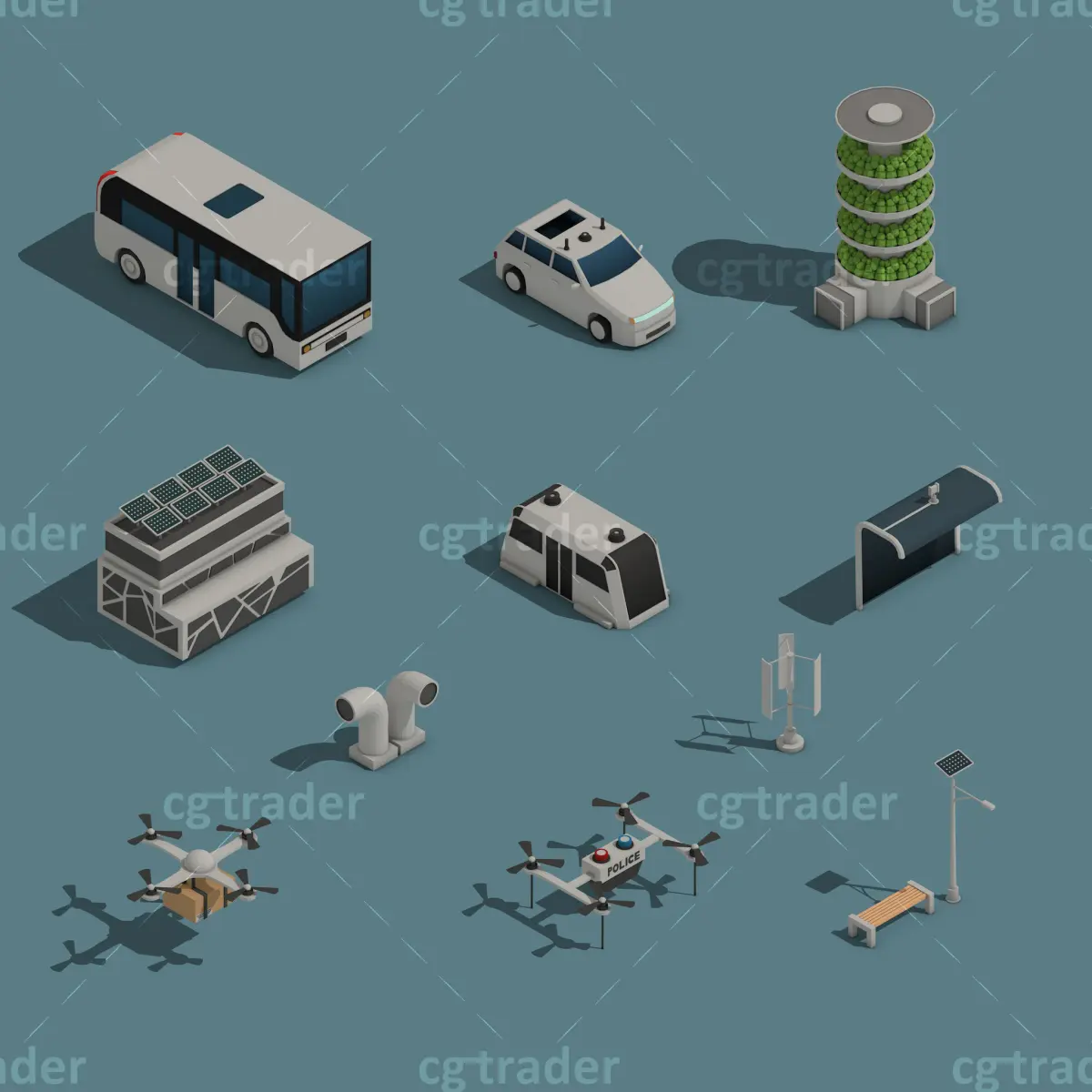 Rendering standard in Cinema 4D. Texture file size(2048*2048), You can easily adjust the color by dragging the uv. Model ready for game, render, make videos, motion graphics, inforgraphic, 3d map..e.t.c. This package contains air purifier, autonomous house, delivery drone, police drone, solar light, unmanned train, unmanned vihicle, vertical framing, wifi in the city, wifi in transport, win power . There are many other packages here: https://www.cgtrader.com/linkdo