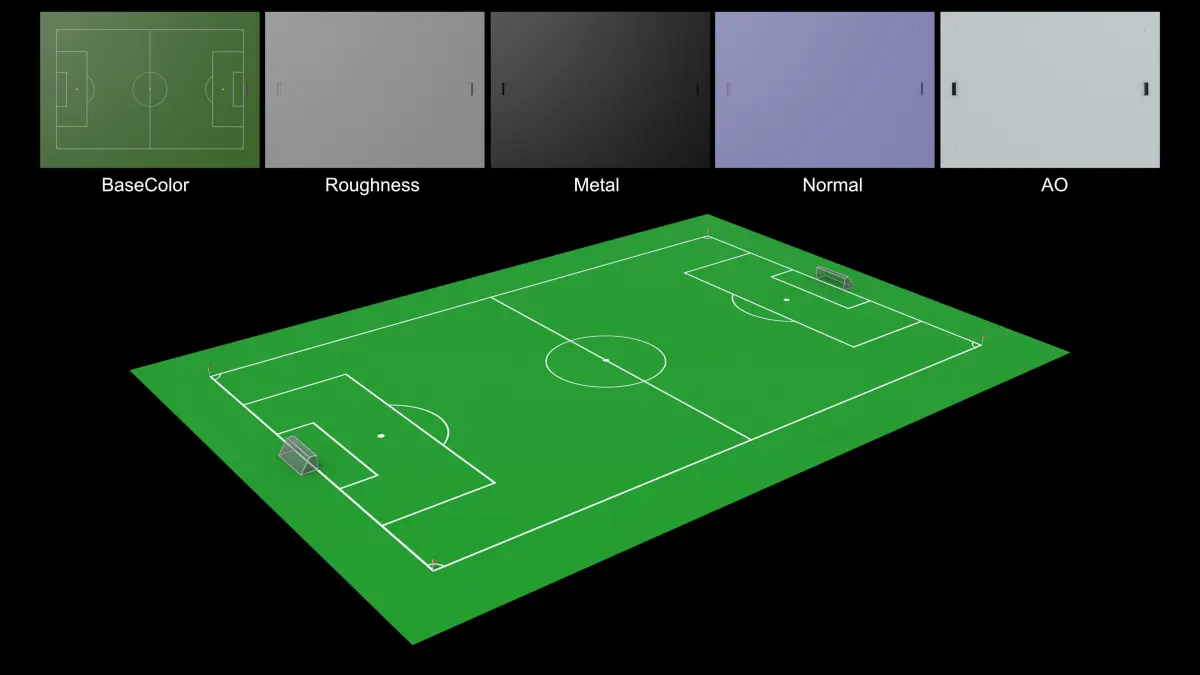 Soccer Field 3D Model – Lightweight and VersatileThis simple yet detailed soccer field model is designed to scale and comes in two versions:Base Color Texture Only – Ideal for lightweight applications.Full PBR Textures – Includes Base Color, Roughness, Metal, Normal, Ambient Occlusion (AO), and Alpha maps for enhanced realism.The model is optimized for presentations, real-time rendering, animations, and other creative projects. Its lightweight design ensures smooth performance across various platforms while maintaining visual appeal.Key Features