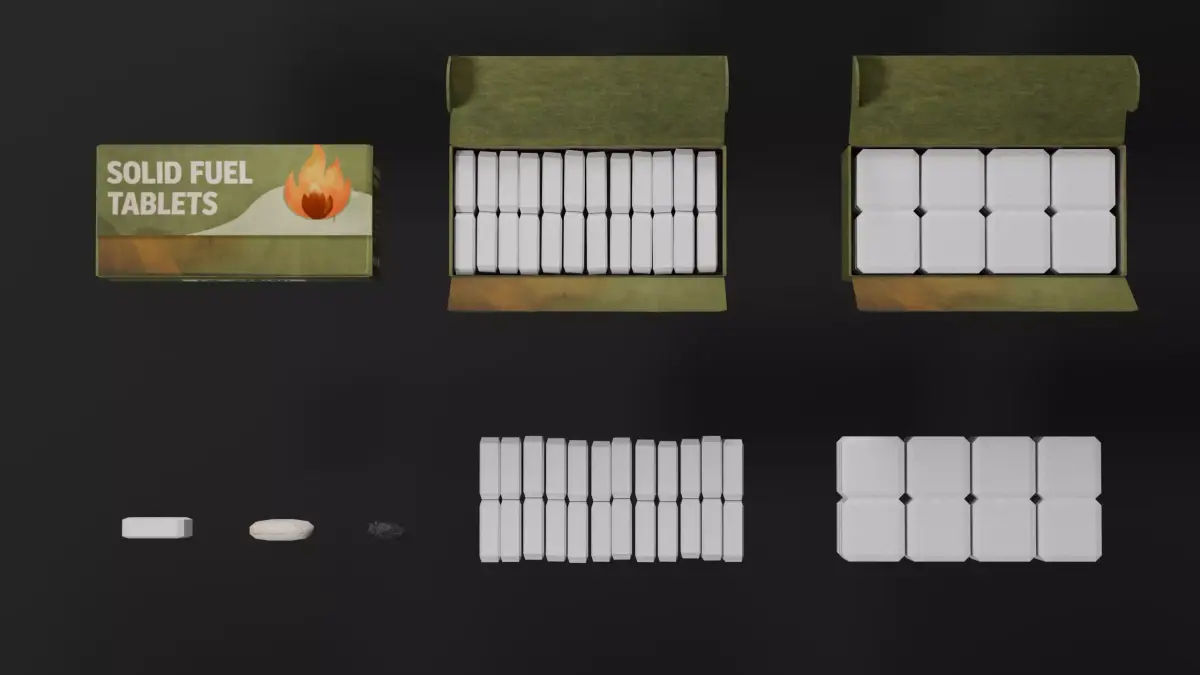 Game-ready solid fuel tablets designed for survival, camping and outdoor environments. This asset includes both closed and open packaging variations, along with multiple content arrangement options for flexible scene setup.The tablets feature three burn stages, allowing you to represent unused, partially burned and fully burned states in your project.Optimized low poly geometry and clean UV layout make this asset suitable for real-time applications, including games, simulations and interactive projects.