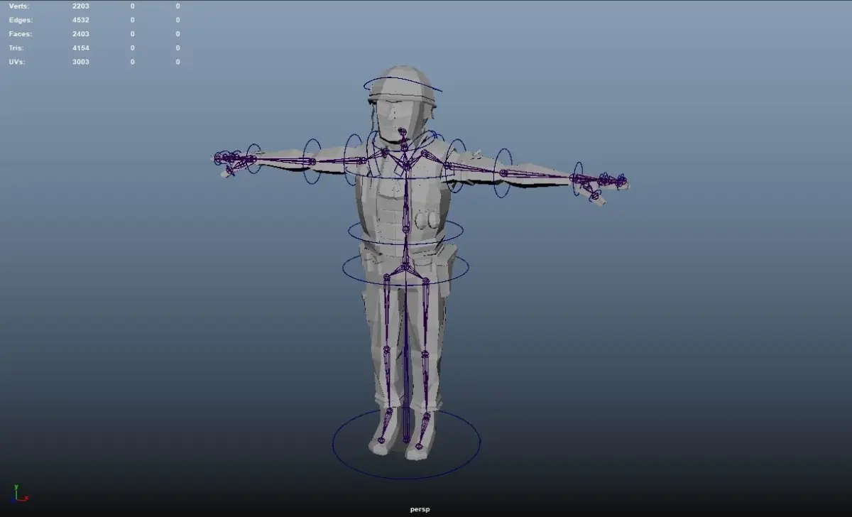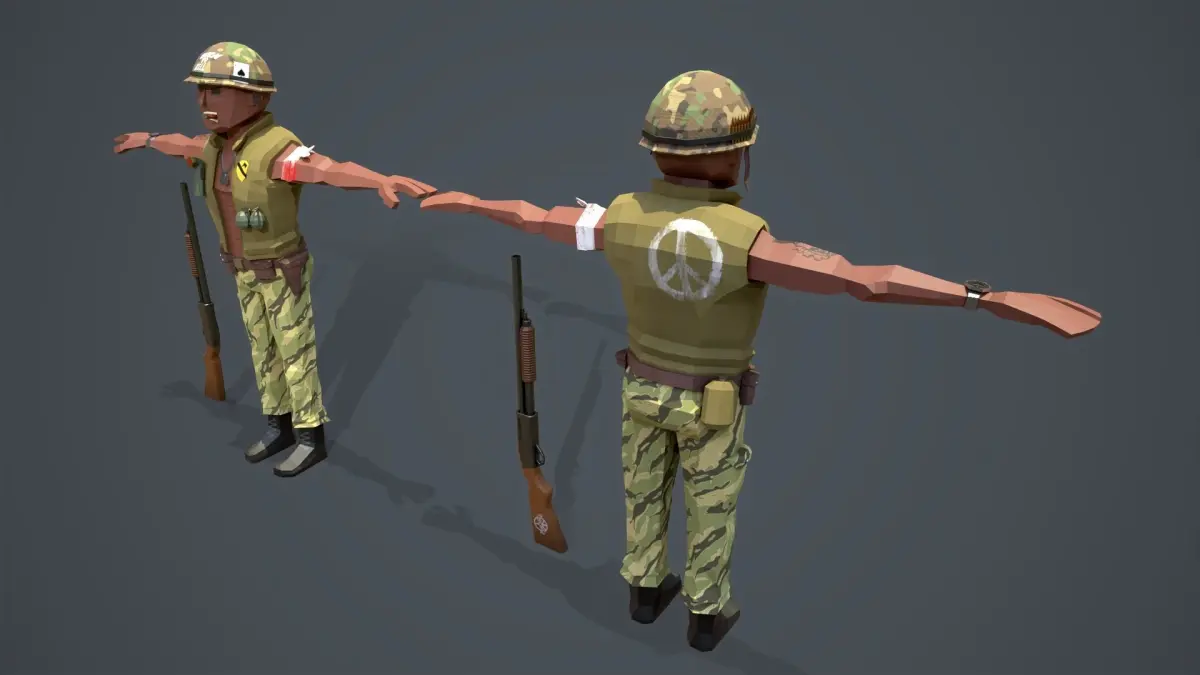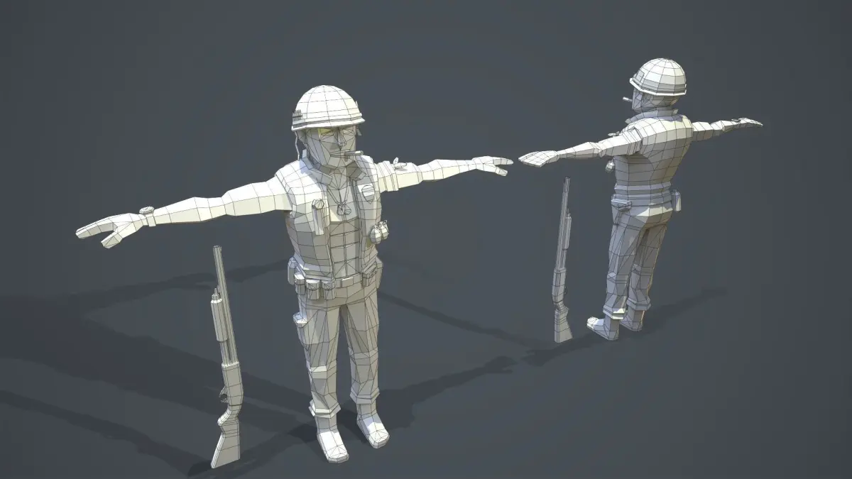 Soldier, Low Poly 3d model, ready for Virtual Reality (VR), Augmented Reality (AR), Mixed Reality (MR), games and other real-time apps. You will get Soldier, gun and granade models in archive with texture maps. LowPoly model has 2403polygons or 4154 tris or 2203 verts. Modeled in Maya 2022, rendered in Marmoset Toolbag v.4.03. FBX file with Cunrol rig may not work in earlier versions !!! You can create your own animations using contol rig or simply use Mixamo website. All animations from video - Mixamo animations.
