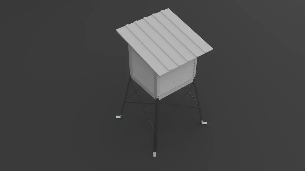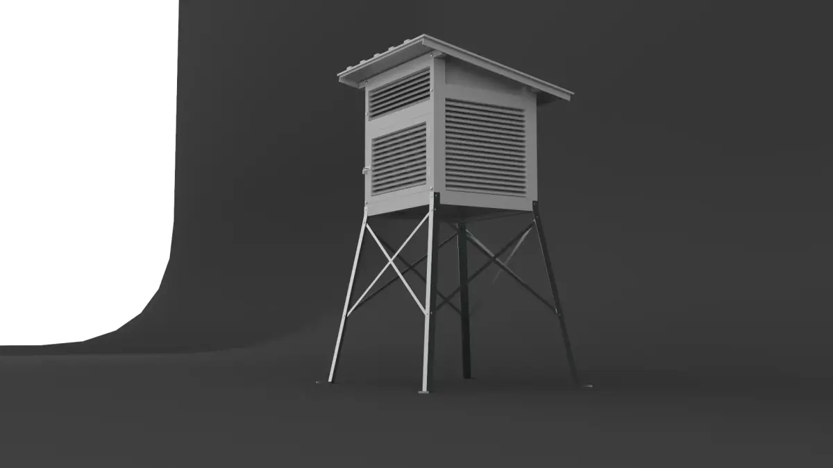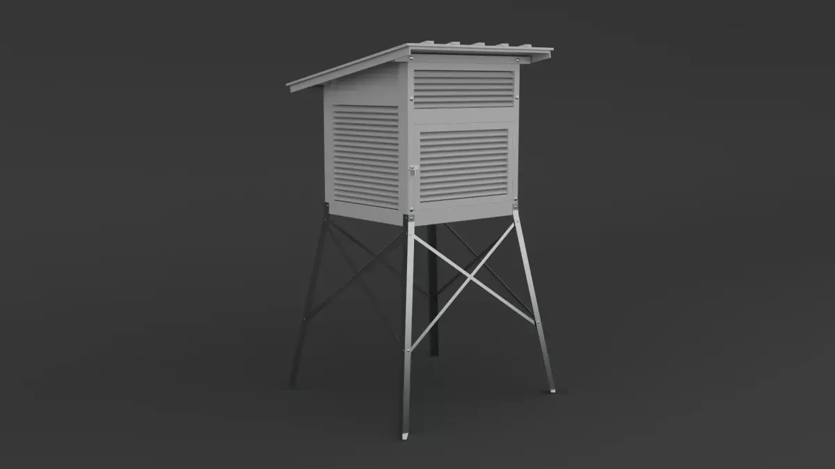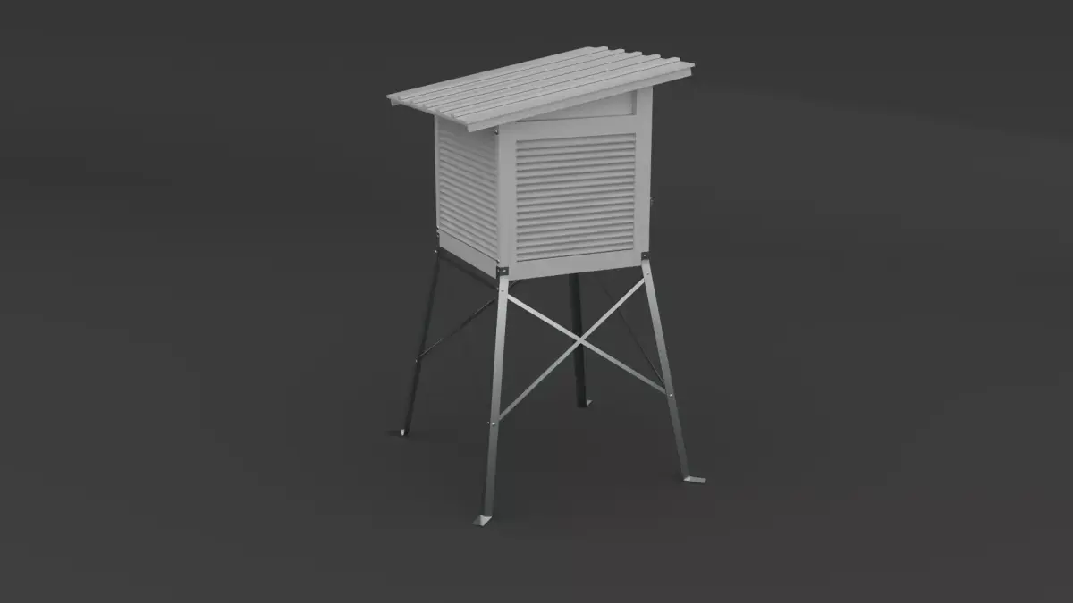 Stevenson screen used for housing meteorological sensors to protect them from direct sunlight, precipitation, and external heat influence.This model represents a typical weather instrument shelter commonly used in environmental monitoring and observation facilities.It is not modeled to real-world engineering specifications and is intended for visual and conceptual use only.