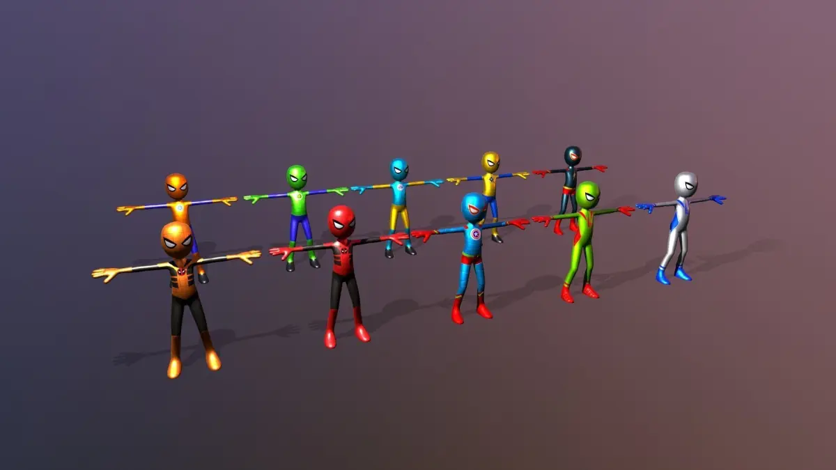 Low poly StickMan Superhero spiderman Pack Rigged Low-poly 3D model Pack 3D modelThis classic superhero rig pack . The following characters are in the pack:Spider man with different texture texture size 2048x2048low poly mobile ready marvel texture stickman superhero