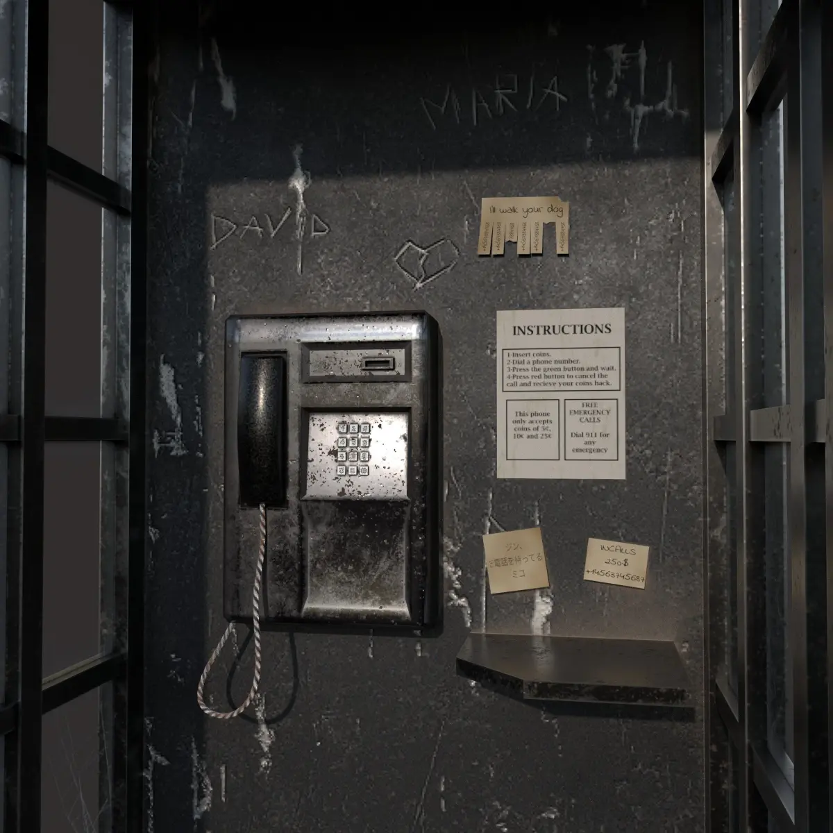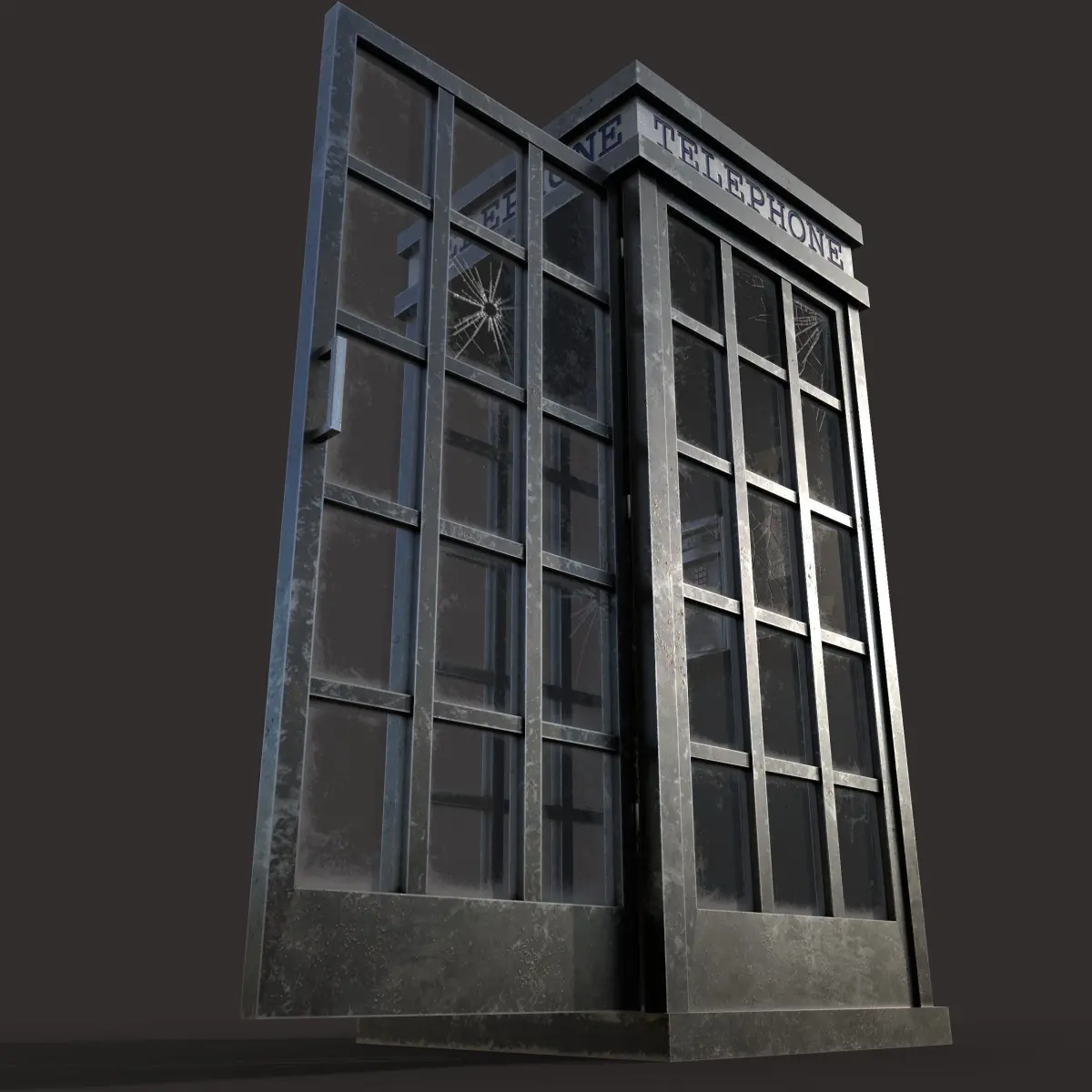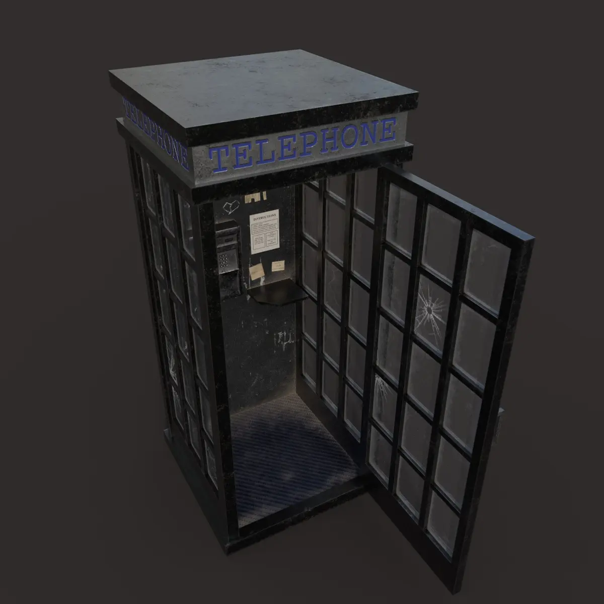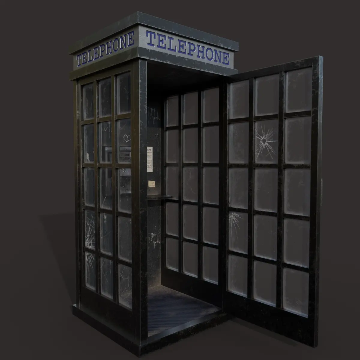 A low poly, game-ready 3D model of a vintage telephone booth. It has a single 2K texture and features realistic details like scratches, smudges, and weathered surfaces, giving it a worn-out, nostalgic appearance. The door can be opened and the phone used. Mesh already triangulated.