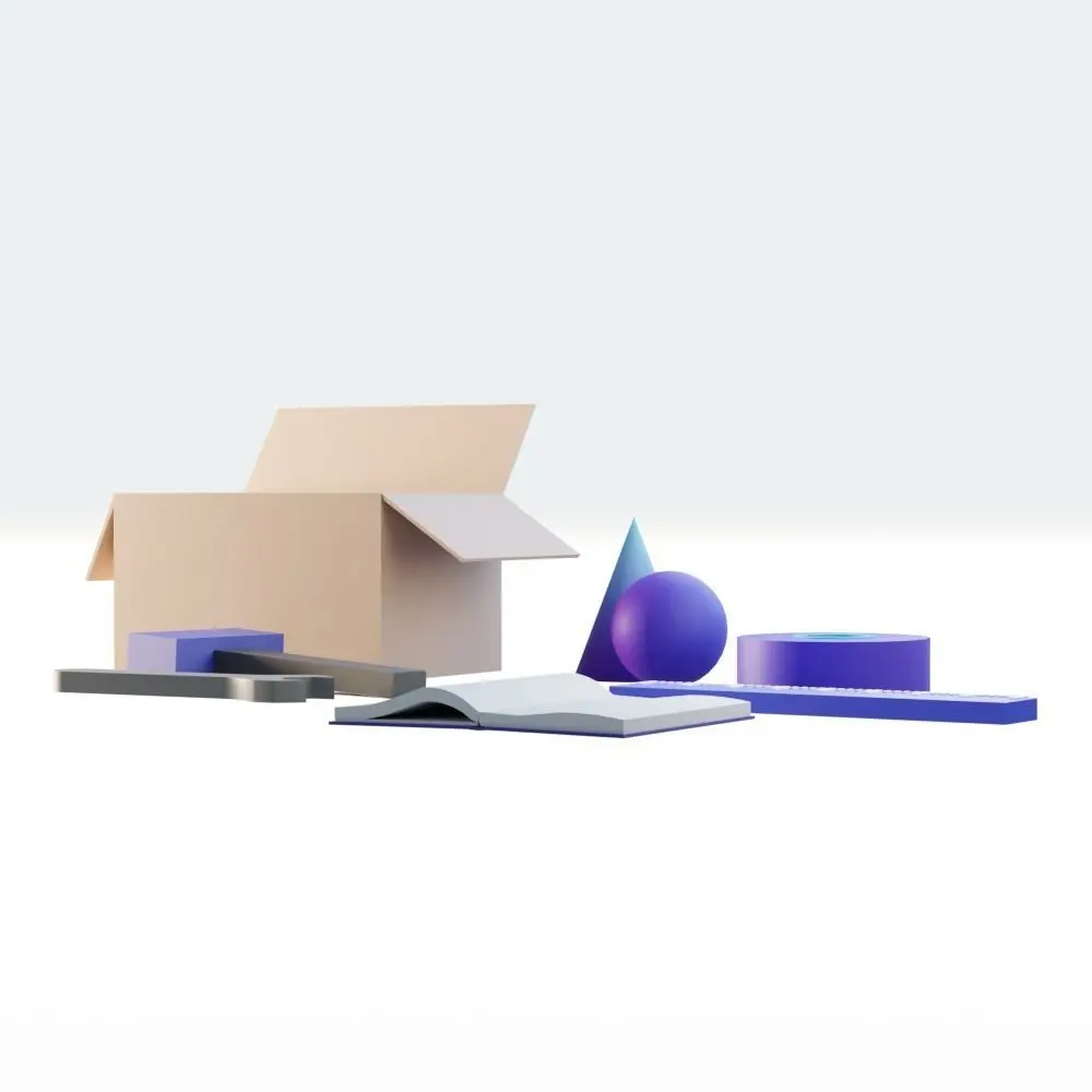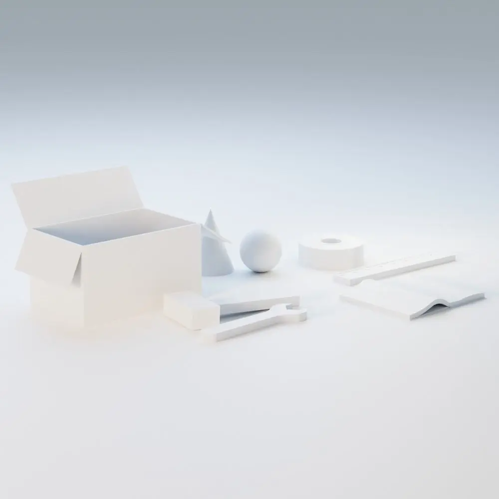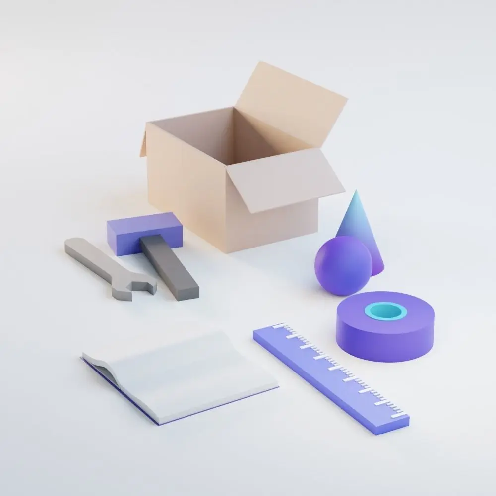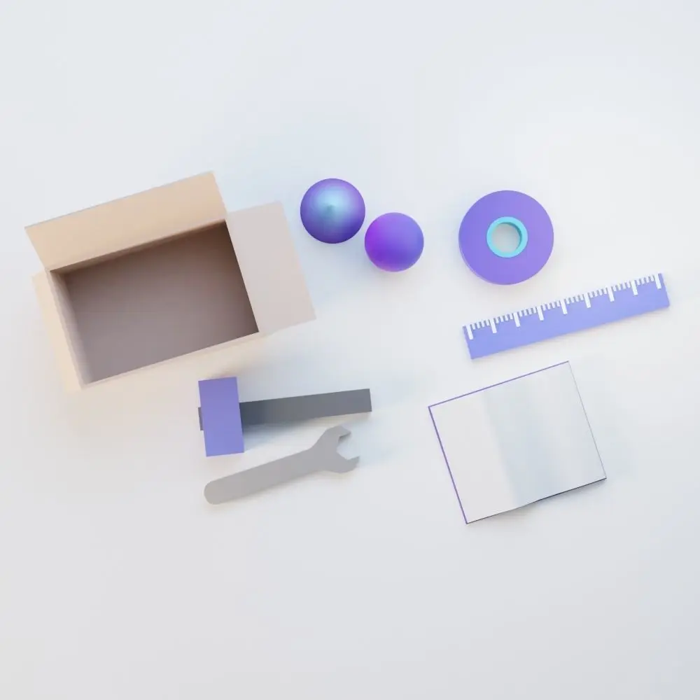 Super low poly. Perfect for a video game or modernist render.Includes abstract shapes, a box, a wrench, a hammer, a ruler, duct tape, and a book.The preview images were rendered using Blender Eevee and Cycles renderers.