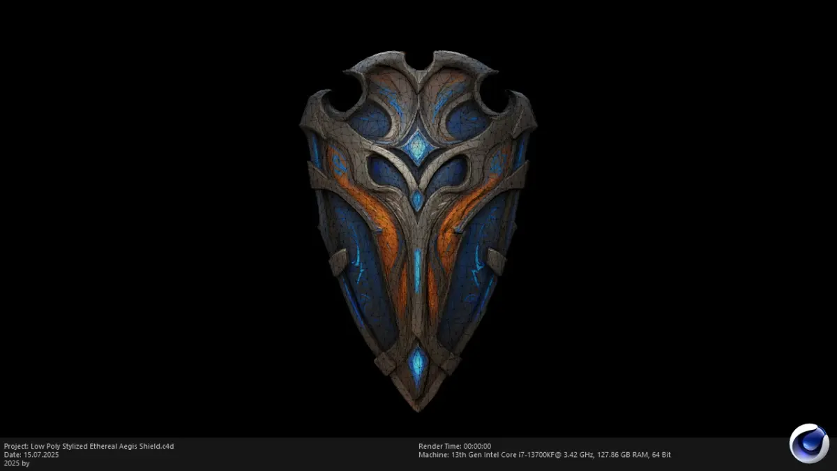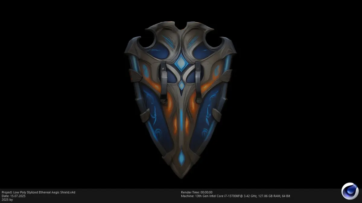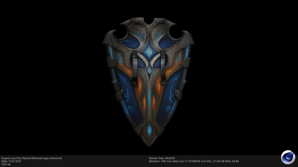 The Low Poly Stylized Ethereal Aegis Shield is a detailed, hand-painted 3D model crafted for stylized fantasy settings. It features a striking mix of deep blue and glowing orange tones, framed by intricately designed metallic borders. The design is both elegant and powerful, suitable for magical knights, enchanted guardians, or elite protectors in any fantasy world.