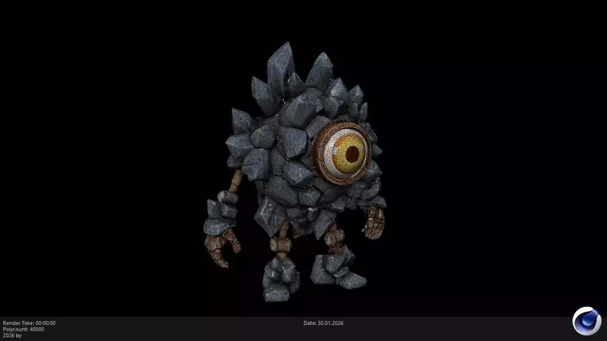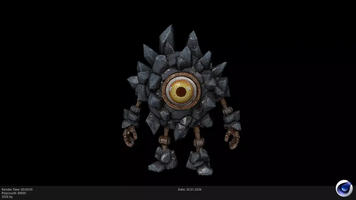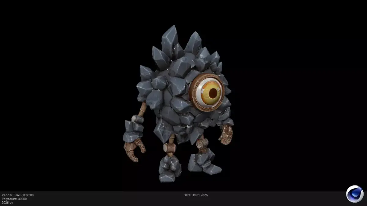 High-Quality Stylized PBR Stone & Gem Character This is a professional, stylized 3D model of a Rock Crystal Elemental, designed as an ancient cave guardian or a powerful earth-based boss. The model features a unique body composed of jagged gray rock shards and large crystals, centered around a massive, glowing golden eye. Built with a full PBR (Physically Based Rendering) workflow, this asset ensures that the stony textures and crystalline surfaces interact realistically with light, while the central eye provides a striking emissive effect.