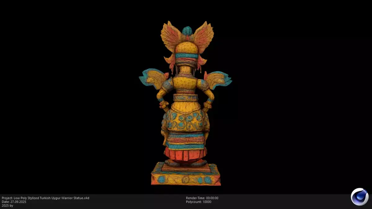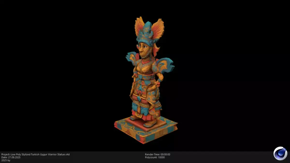 This is a stylized warrior statue inspired by Uygur (Uyghur/Turkic) cultural heritage. The model features detailed hand-painted textures with bright colors, ornamental armor, and a traditional helmet decorated with wings and patterns. Its unique design combines cultural aesthetics with fantasy stylization, making it perfect for games, animations, VR/AR experiences, and cultural/educational projects.