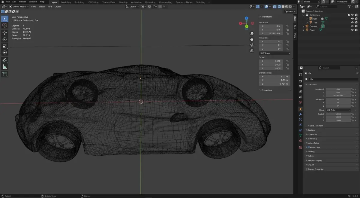 A low poly supercar containing 71,668vertices 142,571 edges 70,614 faces 144,066 triangles Tires and doors are not rigged. EXTERIOR ONLY.