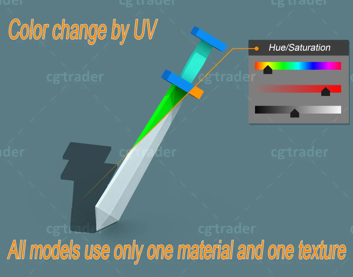 Rendering standard in Cinema 4D. Texture file size(2048*2048), You can easily adjust the color by dragging the uv. Model ready for game, render, make videos, motion graphics, inforgraphic, 3d map..e.t.c. This package contains various types of swords.There are many other packages here: https://www.cgtrader.com/linkdo