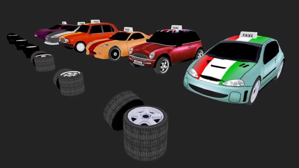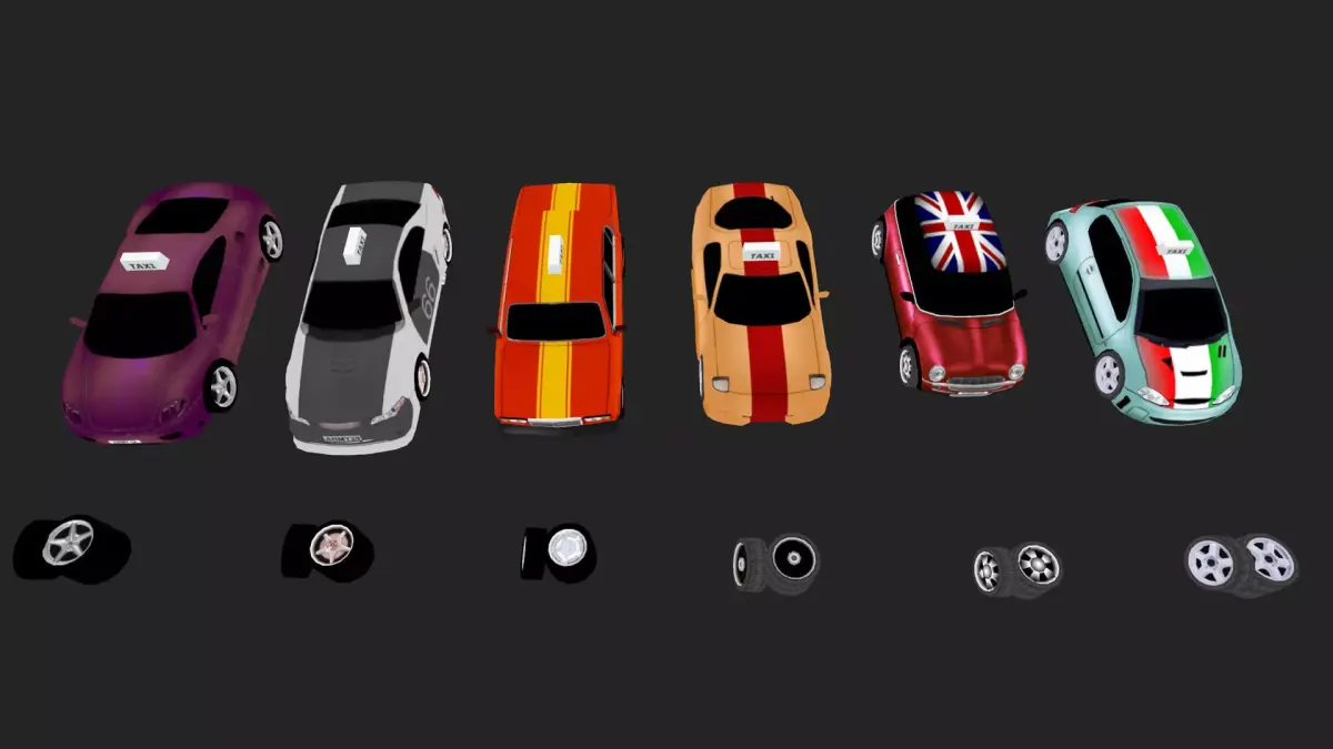 Multiple taxi car modelsWheel and tire variationsReady-to-use materialsClean and organized hierarchy