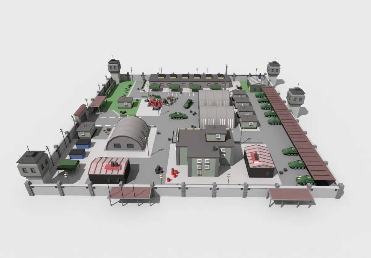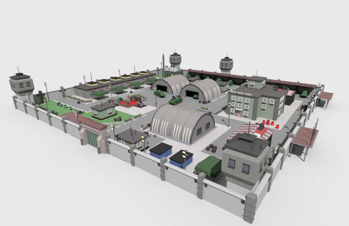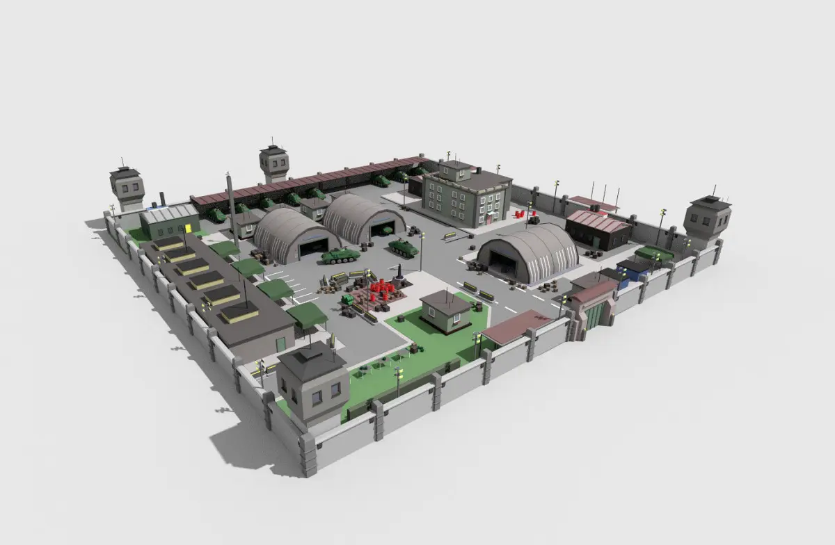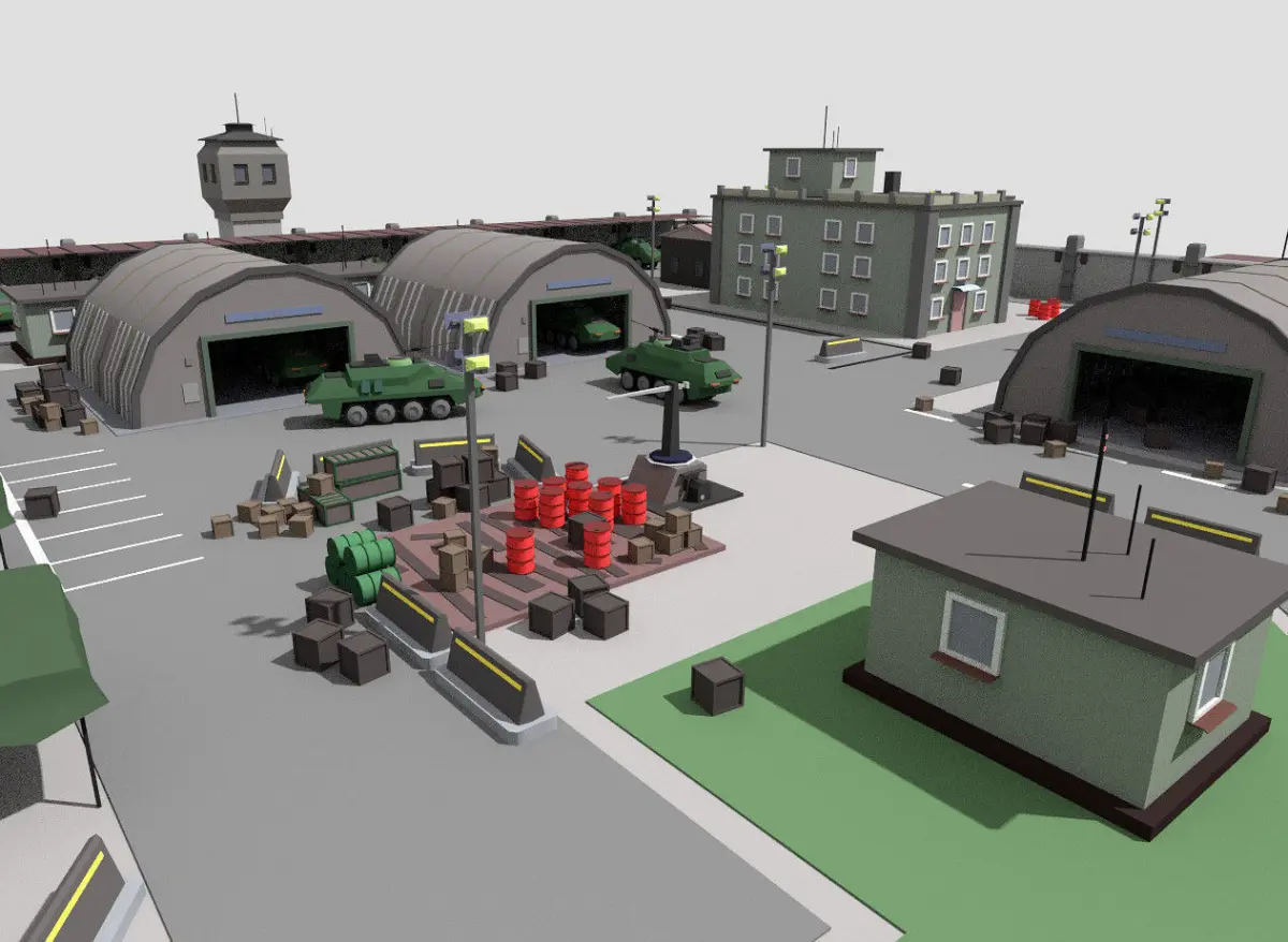Scene of low poly toon military camp.