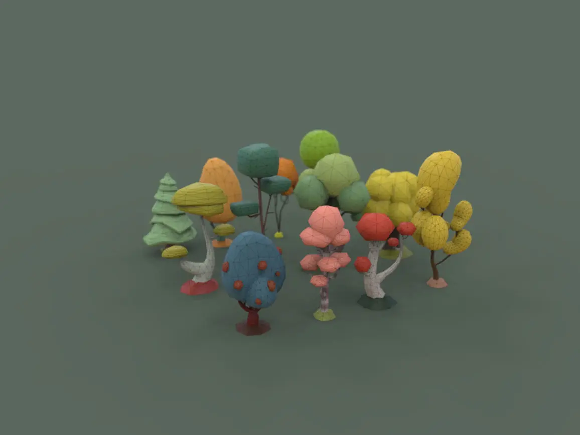 In this pack of 3D tree models you will find 12 different and beautiful trees with a low number of polygons (between 300 vertices and 1400 vertices each tree) ideal for use as game assets.