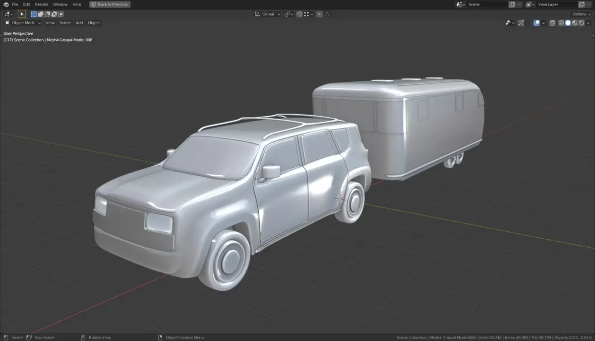 A simplistic model of a vehicle based SUV + Spartan CaravanModel created in Blender 2.9It has materials applied as seen on the render/images.Multiple file formats, good topology, median point at the center base of the model. Low and high polygons versions.