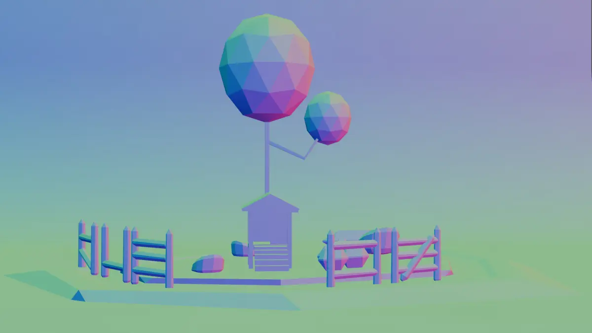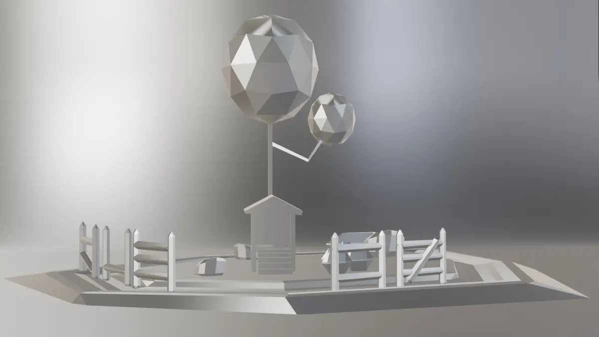 Includes house, trees, fence, rocks, and ground