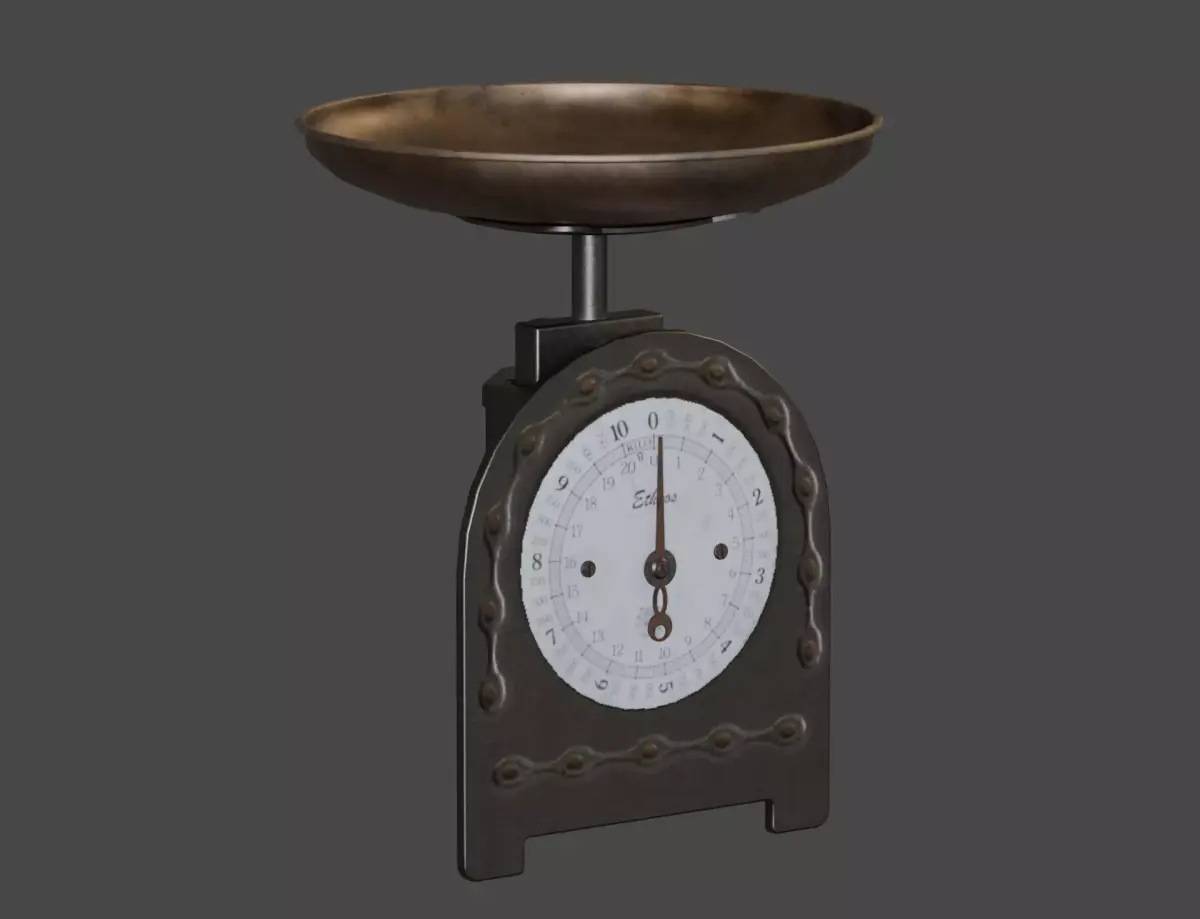Low-Poly model of Vintage Kitchen Scale. Originally created with Blender. Previews are rendered with Cycles.2K Diffuse, Normal, Roughness, Metalness maps are included.