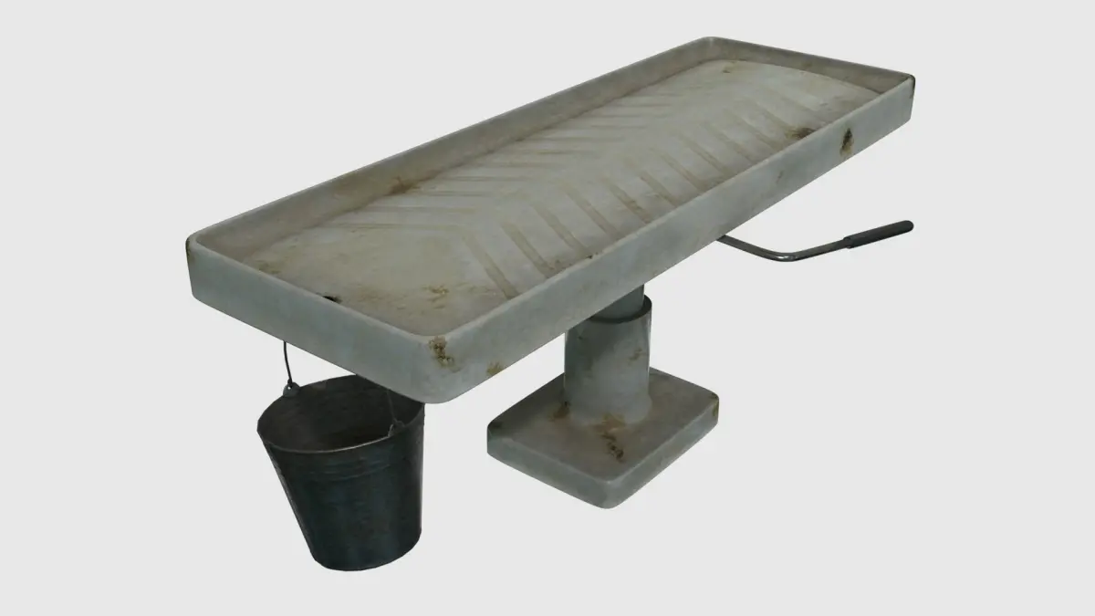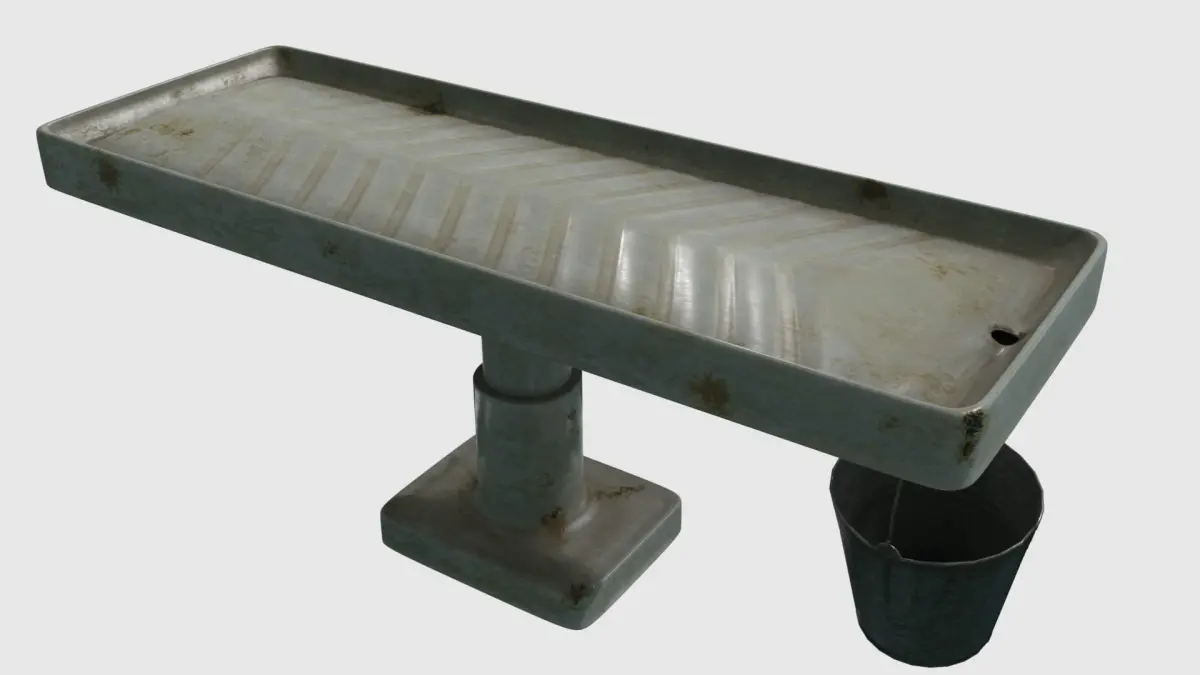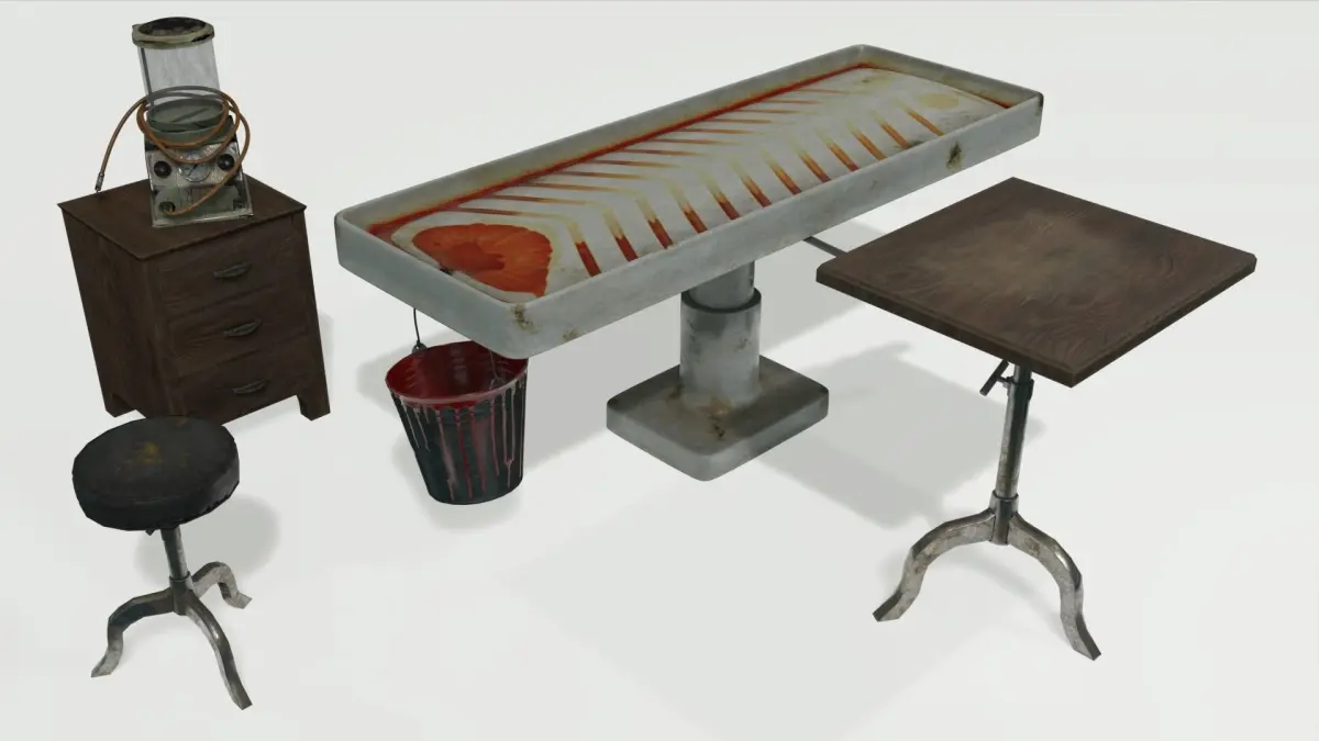 Vintage, low-poly mortuary items made in Blender, Cycles that include an embalming table, a cabinet, a stool, embalming machine and table. The embalming table comes with and without blood variants, all of them with PBR materials with diffuse, metal, roughness and normal maps. Ideal for games and period scenes.