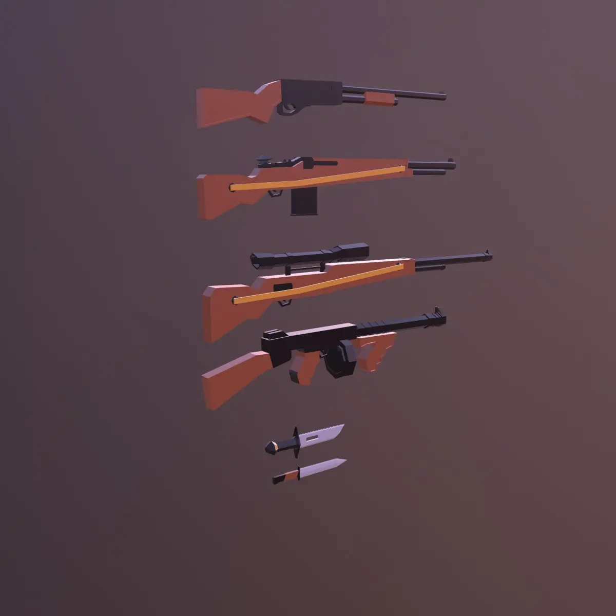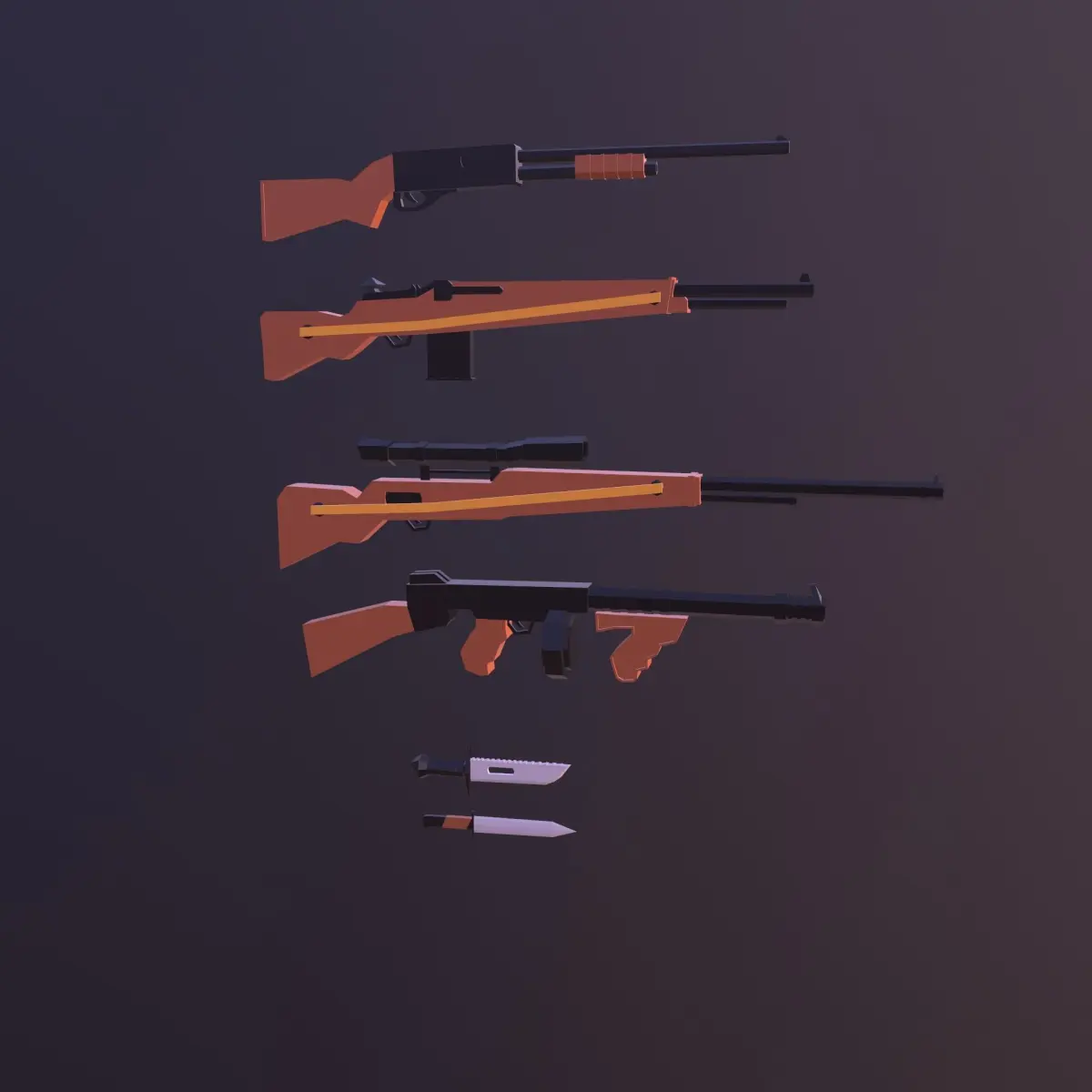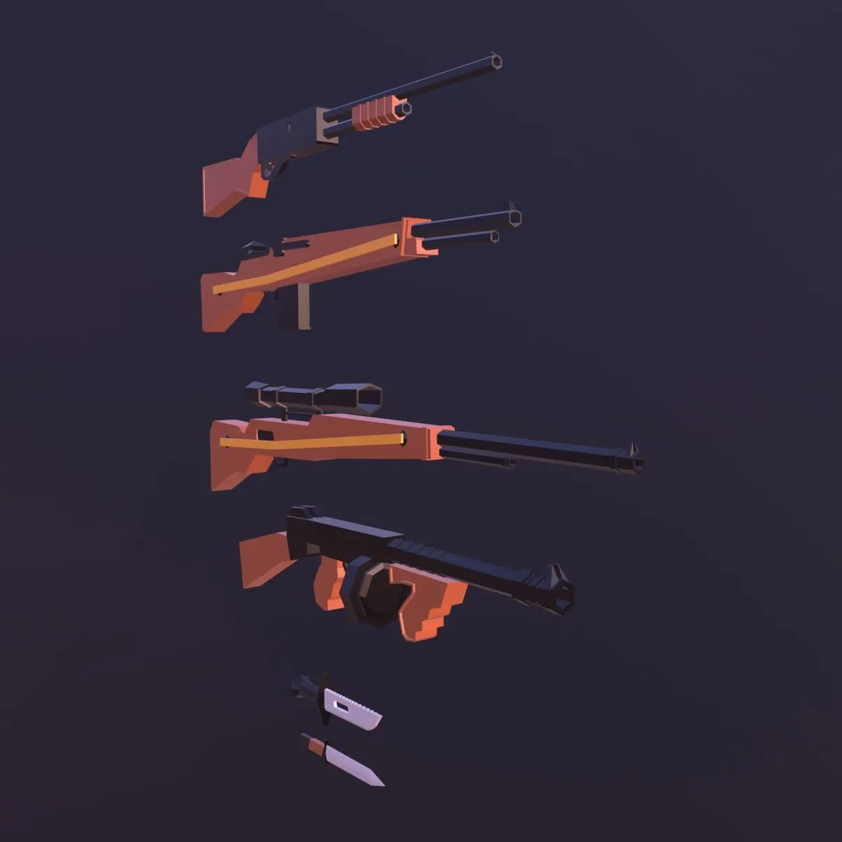 Included4 Weapon 2 KnifeShotgun / 916 TrisShotgun 2 / 874Sniper Gun / 1257Automatic Gun / 1288Rambo Knife / 1278Standart Knife / 148All texture 1028 UV Diffuse(Albedo) Map Blend file and Unity file Game Ready Model