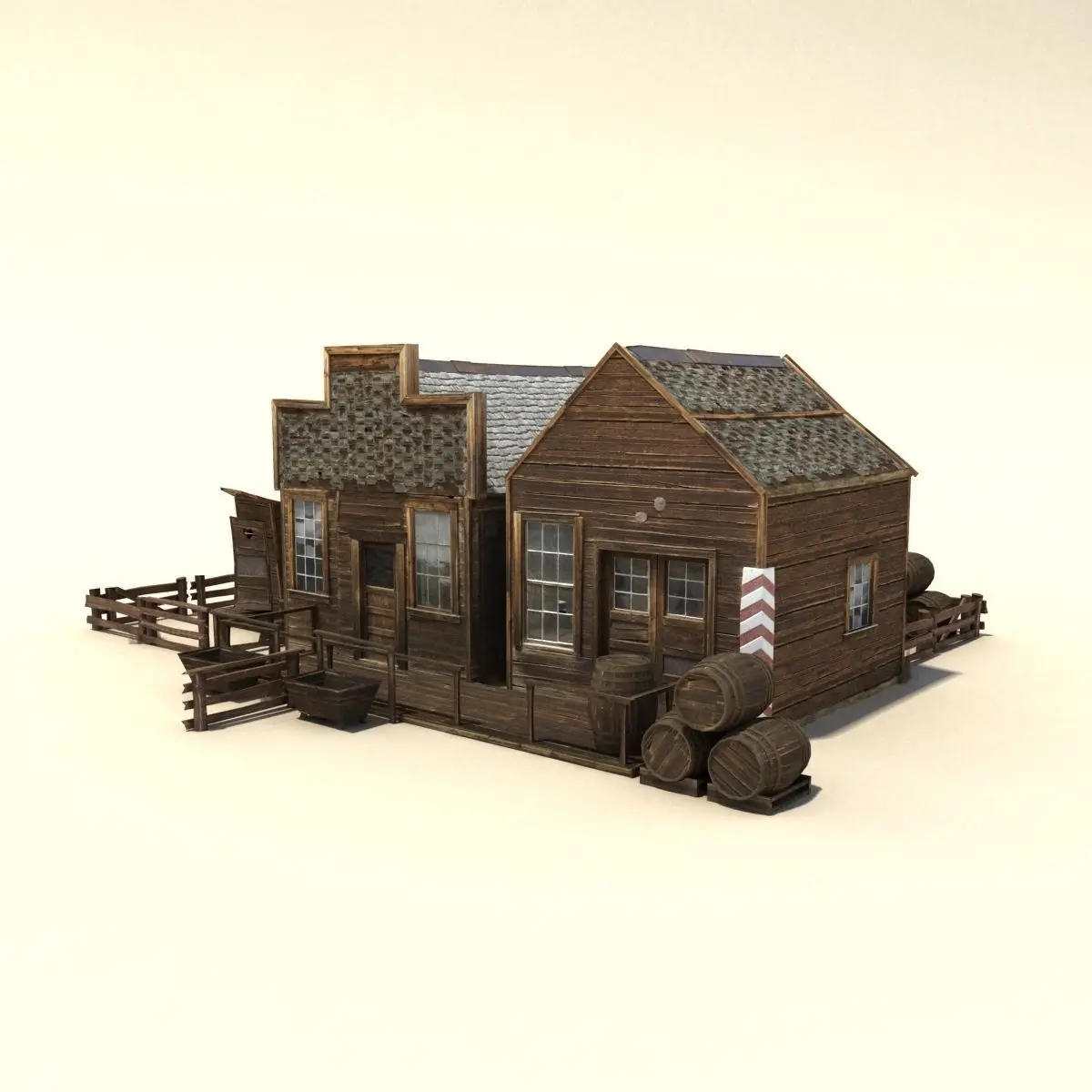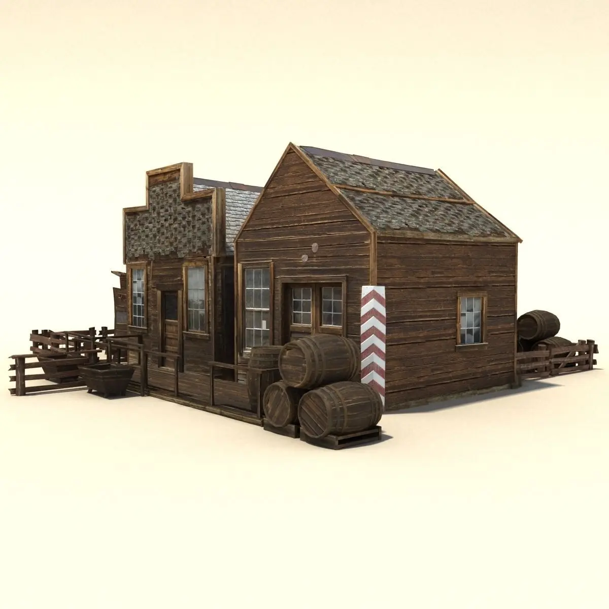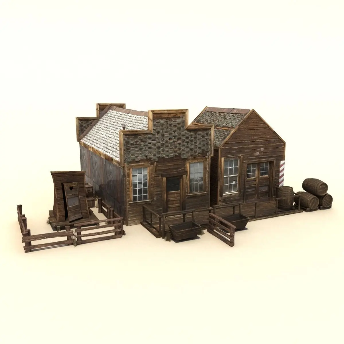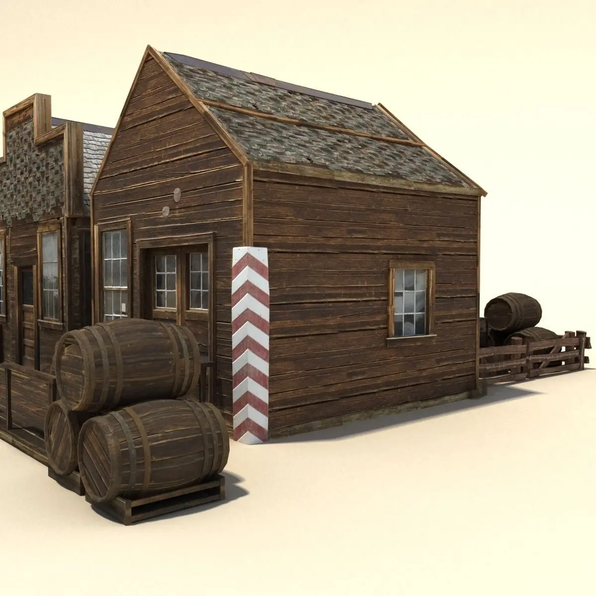 A 3D model of Old Wild West buildings.Product's features:- Eesolution of textures.:main: 3673x4096, 6460x7741box: 662x441 pxbush: 962x532, 577x593fence: 2048x1642