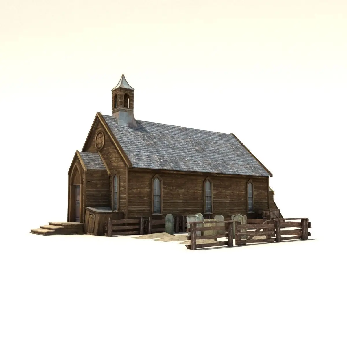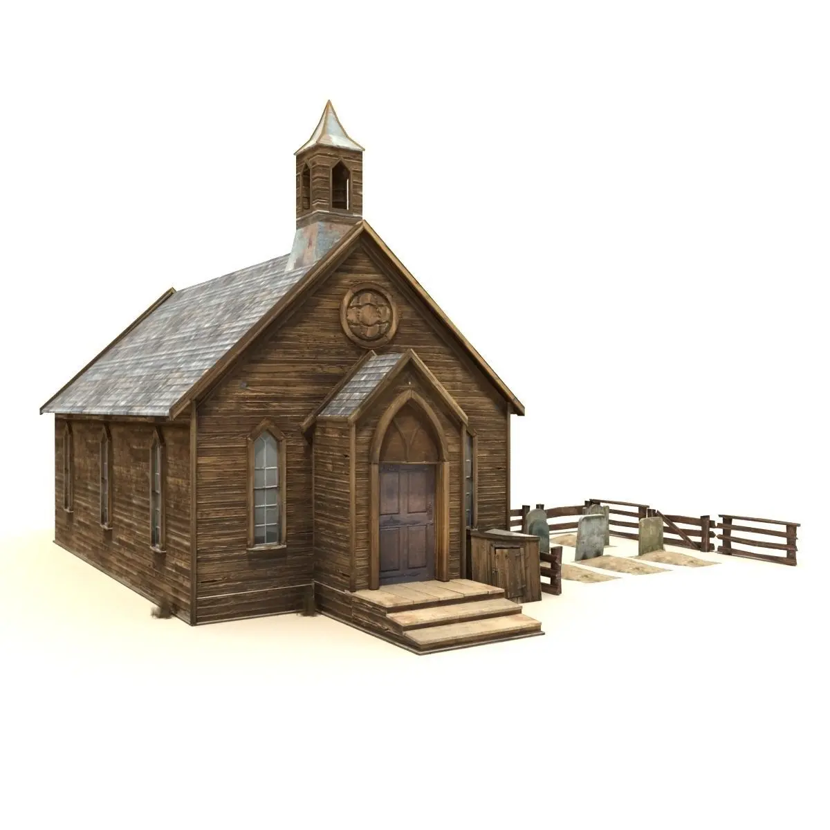 A 3D model of Old Wild West Church with small cemetery. Product's features:- Eesolution of textures.: main: 1953x1497 px box: 662x441 px tombstone: 2094x2048 bush: 962x532, 577x593 - Originally created with 3ds Max 2014- Unit system is set to centimeter. Model is built to real-world scale-Texture Set: Diffuse, Specular, Bump map- Previews rendered in 3ds Max 2014 using V-ray Adv 2.3.